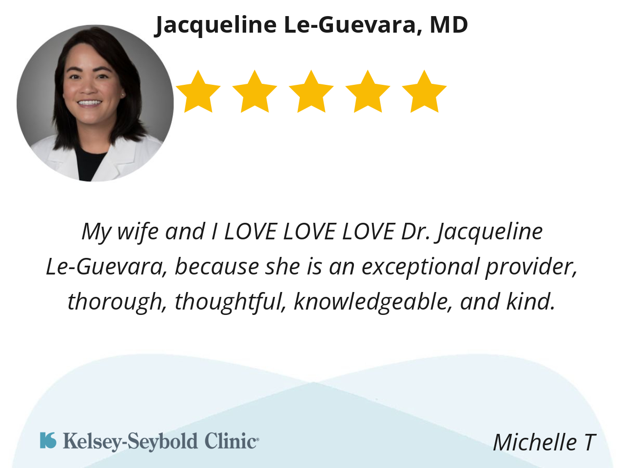 My wife and I LOVE LOVE LOVE Dr. Jacqueline Le-Guevara, because she is an exceptional provider, thorough, thoughtful, knowledgeable, and kind.