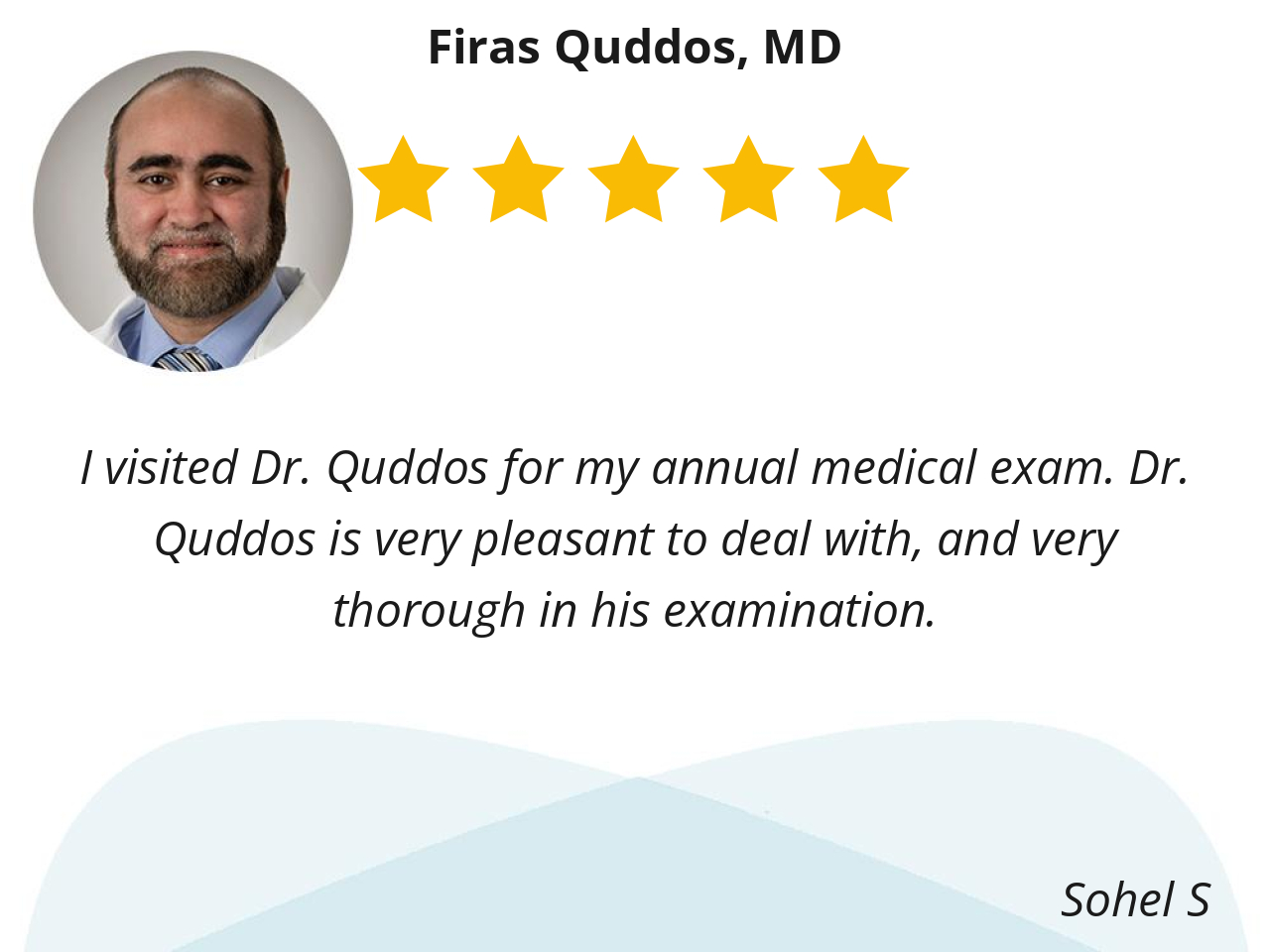 I visited Dr. Quddos for my annual medical exam. Dr. Quddos is very pleasant to deal with, and very thorough in his examination.