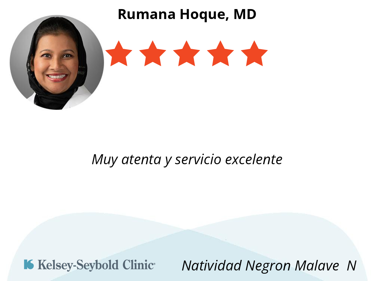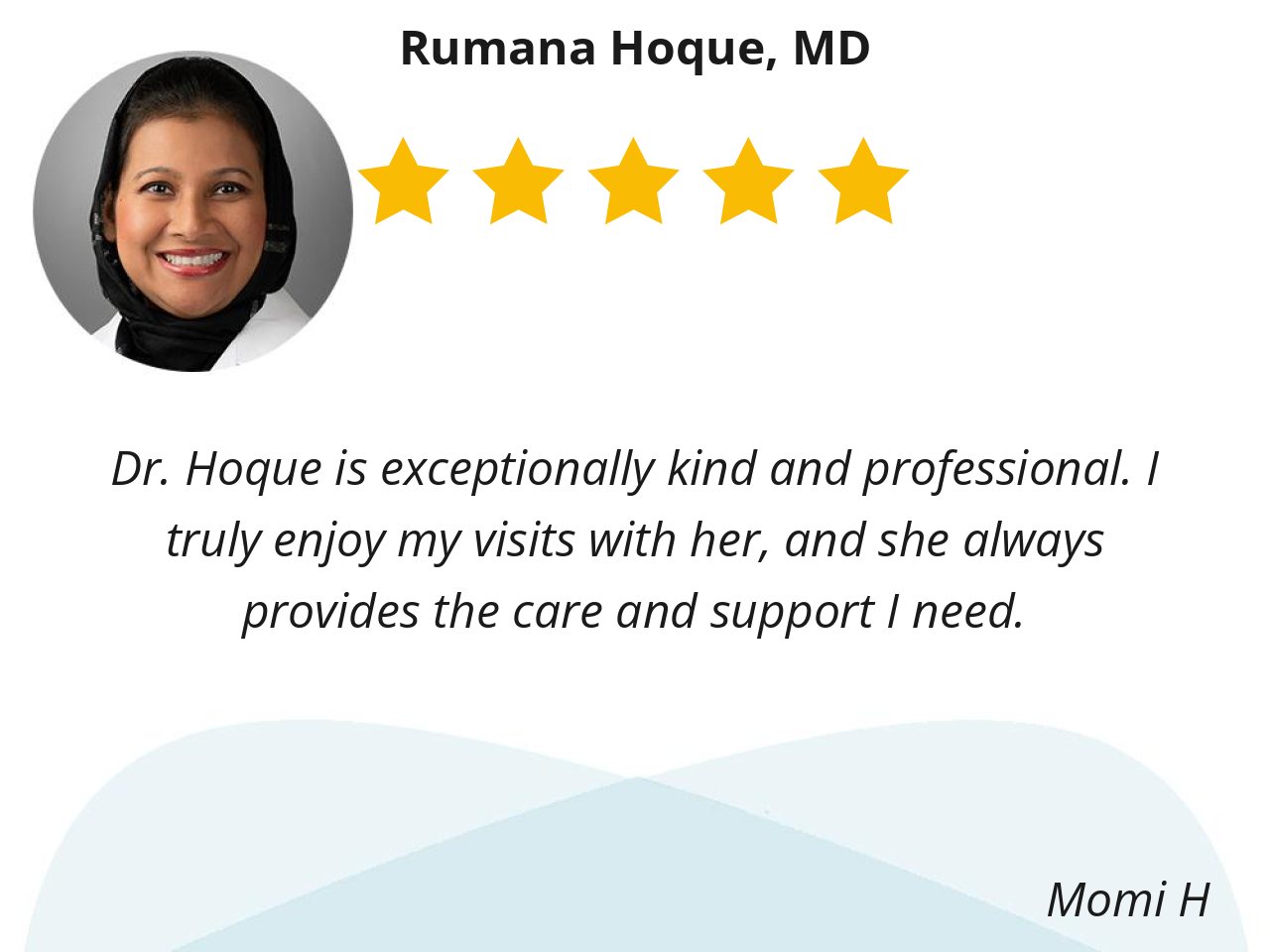 Dr. Hoque is exceptionally kind and professional. I truly enjoy my visits with her, and she always provides the care and support I need.