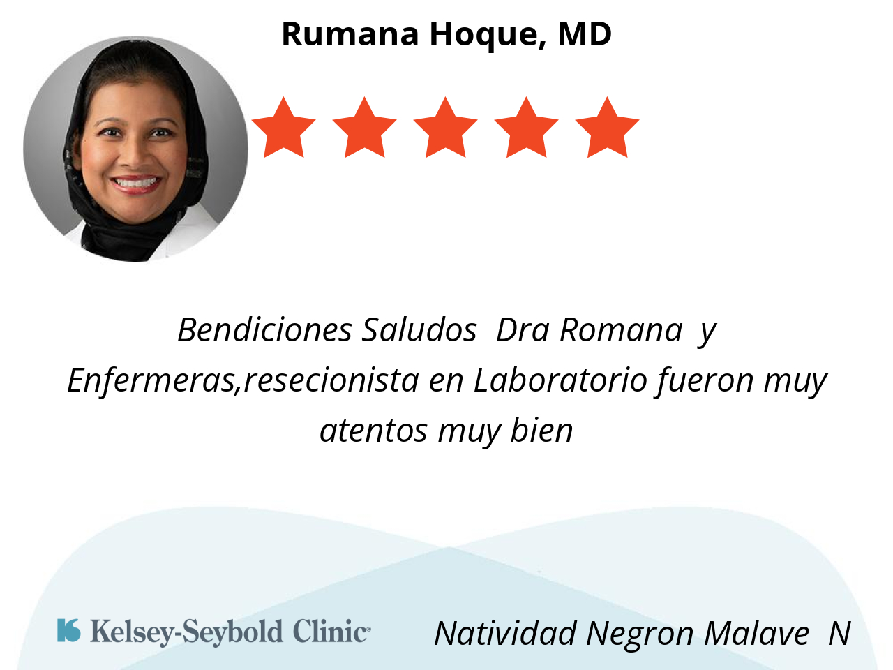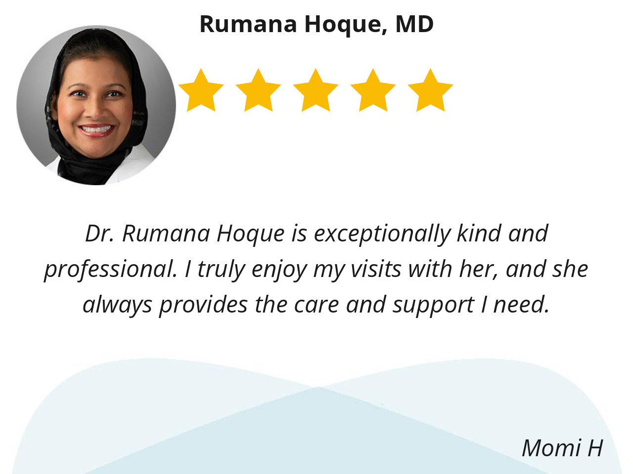 Dr. Rumana Hoque is exceptionally kind and professional. I truly enjoy my visits with her, and she always provides the care and support I need.