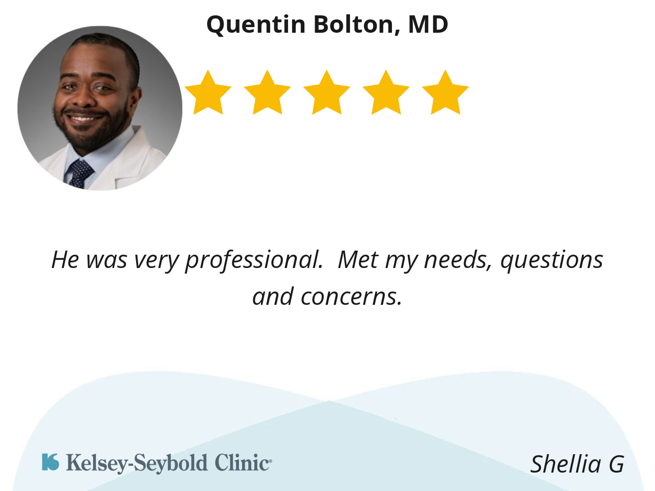 Dr Bolton, was very detailed, he explained things very well. I felt welcomed, it’s good when your doctor actually spends time explaining things before they work with you. I highly recommend him!