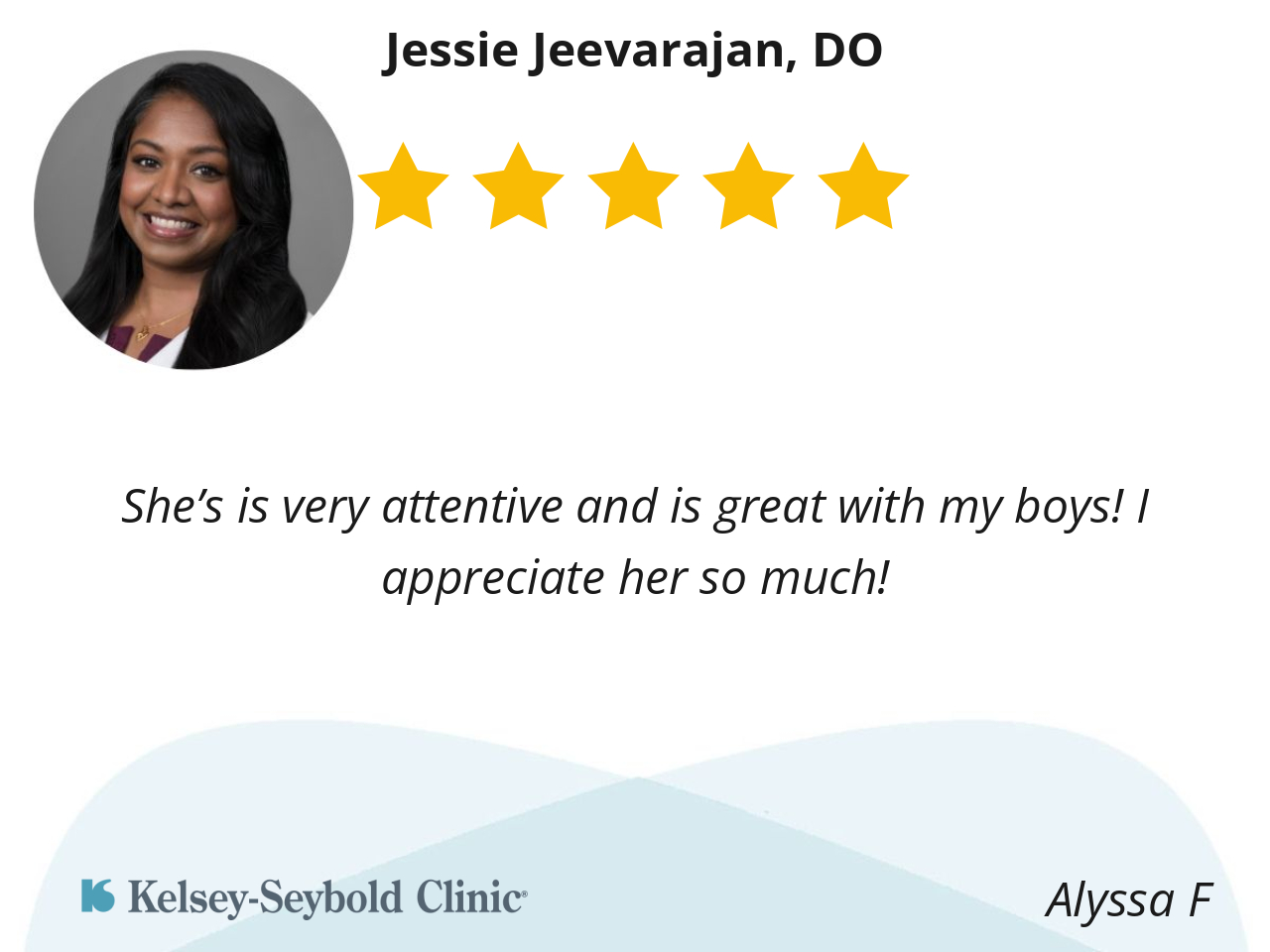 Dr. Jessie has been very caring and attentive with our son. We greatly appreciate it and recommend her to others. Thank you.