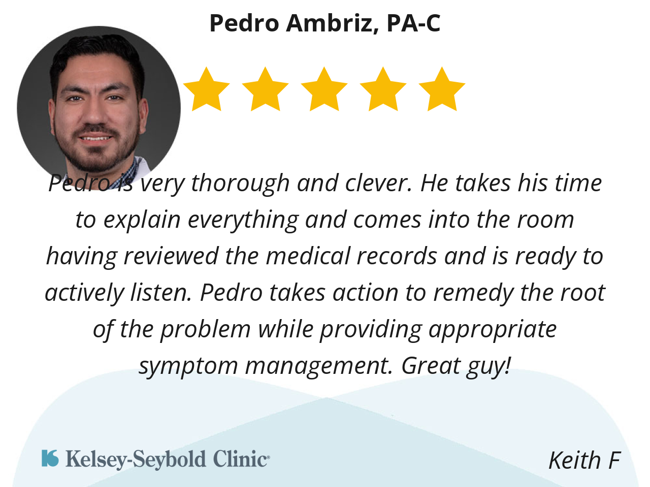 Pedro is very thorough and clever. He takes his time to explain everything and comes into the room having reviewed the medical records and is ready to actively listen. Pedro takes action to remedy the root of the problem while providing appropriate symptom management. Great guy!
