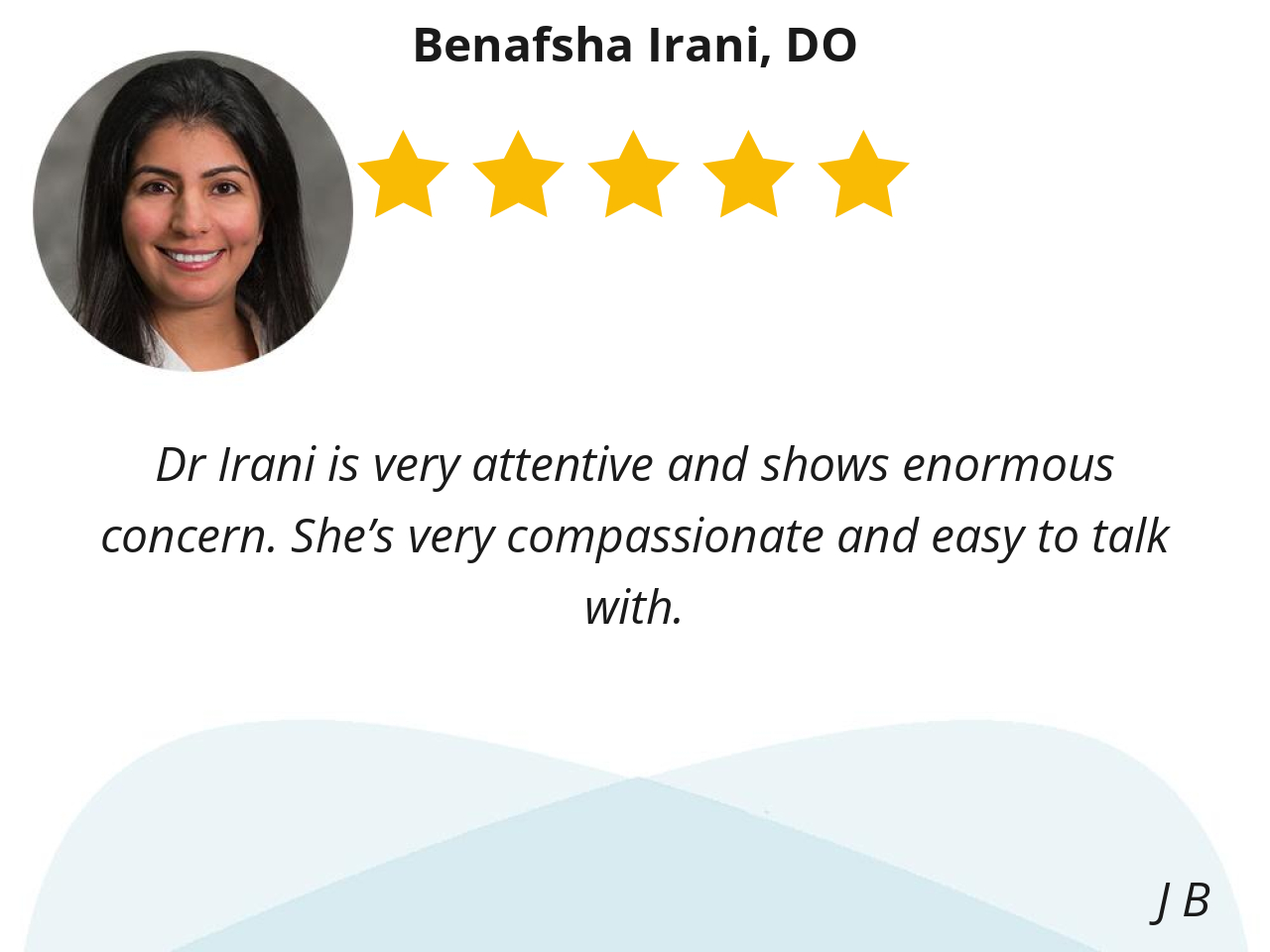 Dr Irani is very attentive and shows enormous concern. She’s very compassionate and easy to talk with.
