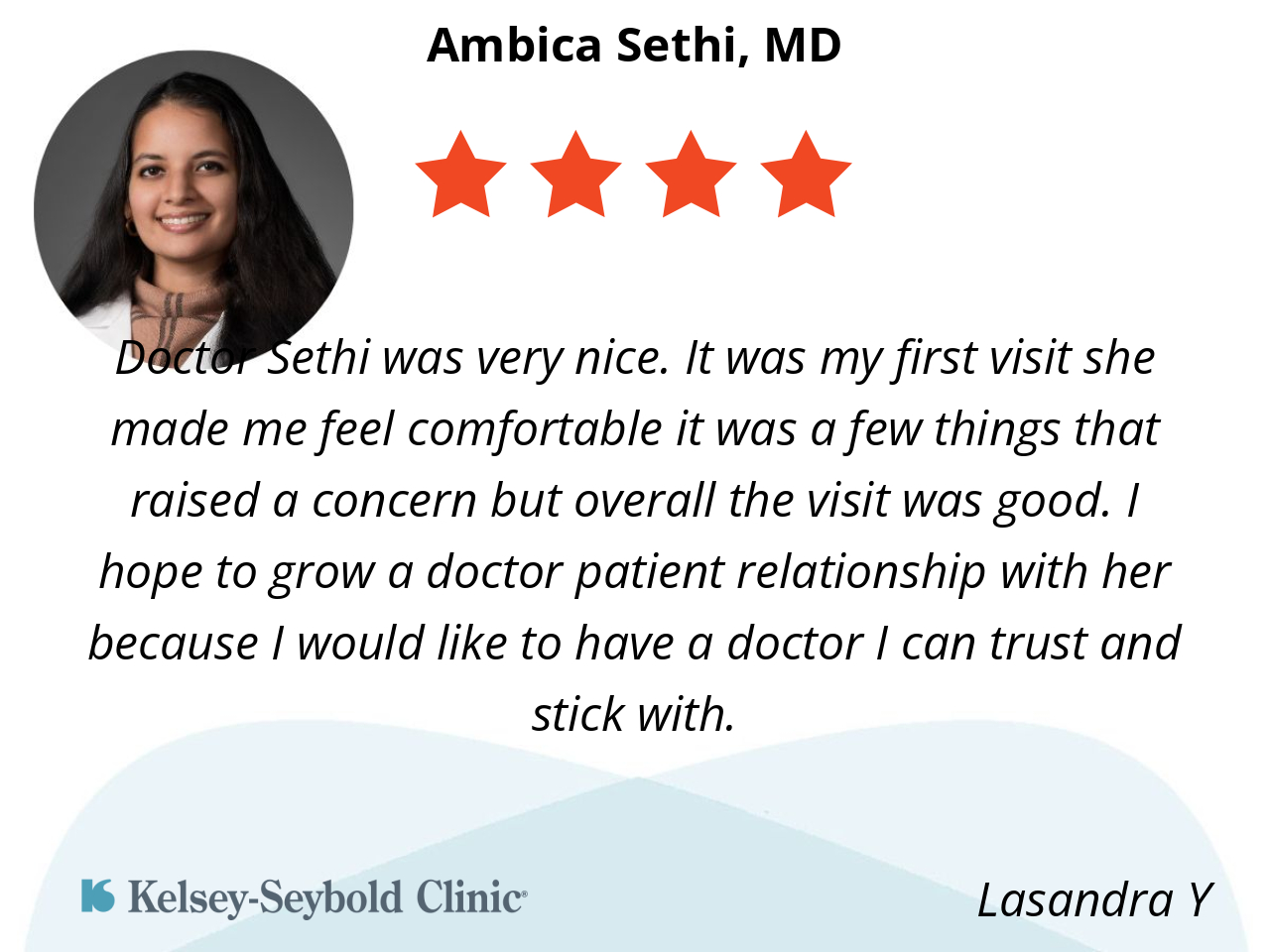 Doctor Sethi was very nice. It was my first visit she made me feel comfortable it was a few things that raised a concern but overall the visit was good. I hope to grow a doctor patient relationship with her because I would like to have a doctor I can trust and stick with.