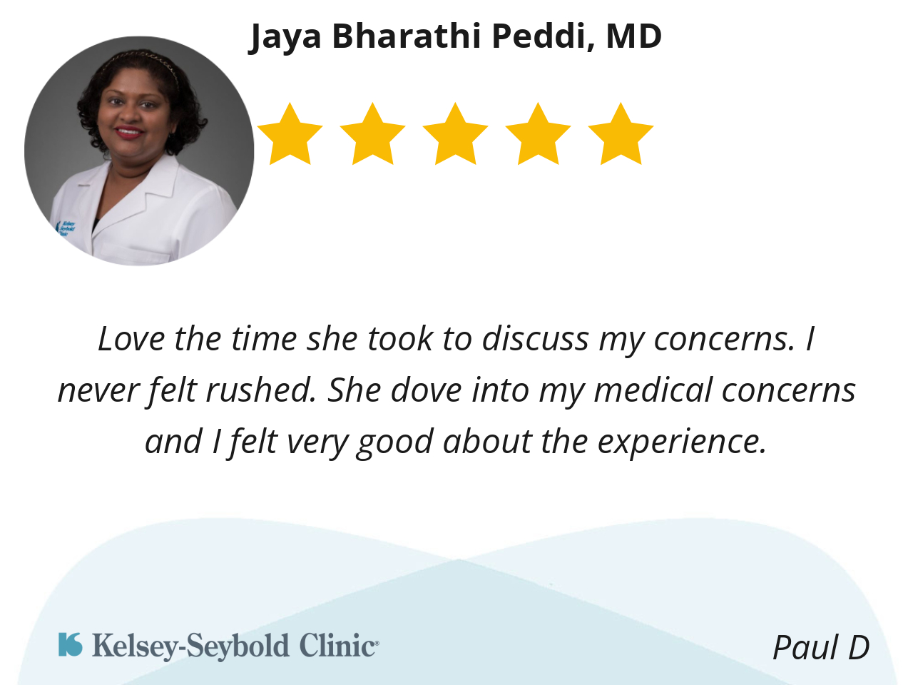 I’m glad to have Dr Peddi as my PCP. For all my concerns she thinks of it as a part of my body, not one small independent organ. So she considers the whole person and how the constitution works and treats the whole person. I appreciate and value her approach to keep me healthy.