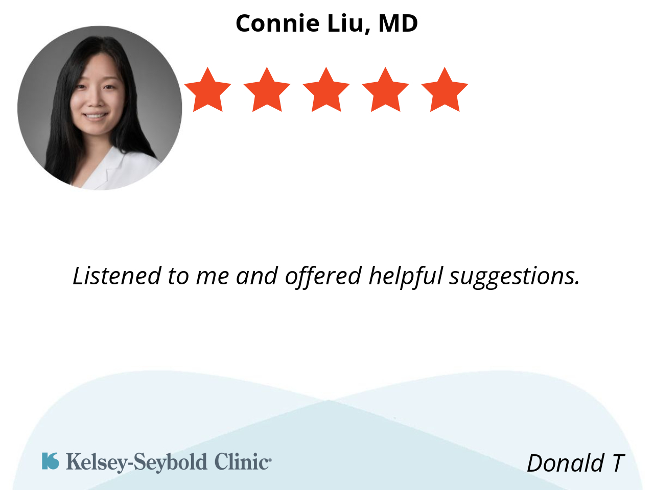 Easy to talk to about my medical concerns. She's very engaged and thorough. I'm very comfortable with her as my PCP.