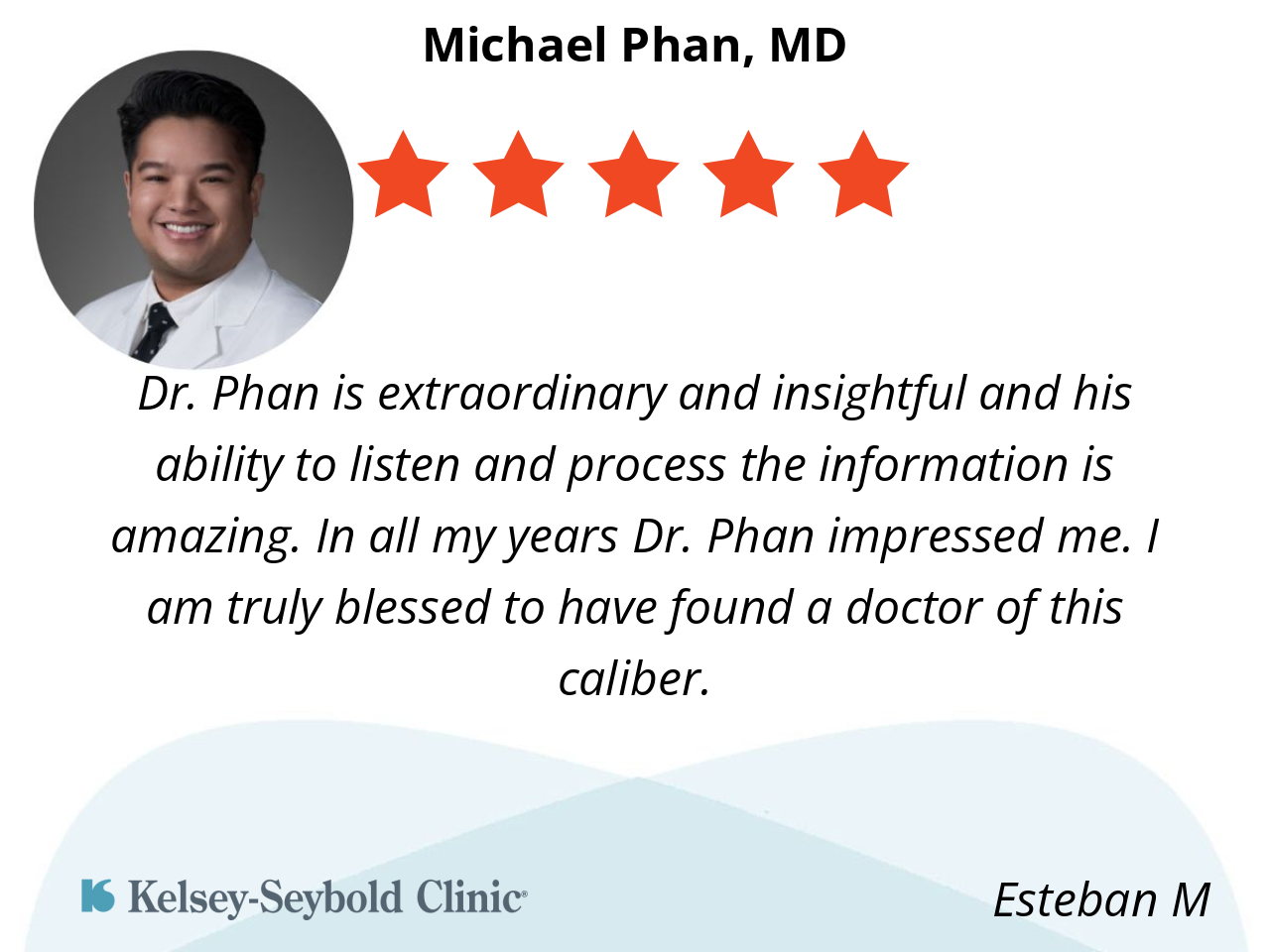 Dr. Phan is extraordinary and insightful and his ability to listen and process the information is amazing. In all my years Dr. Phan impressed me. I am truly blessed to have found a doctor of this caliber.