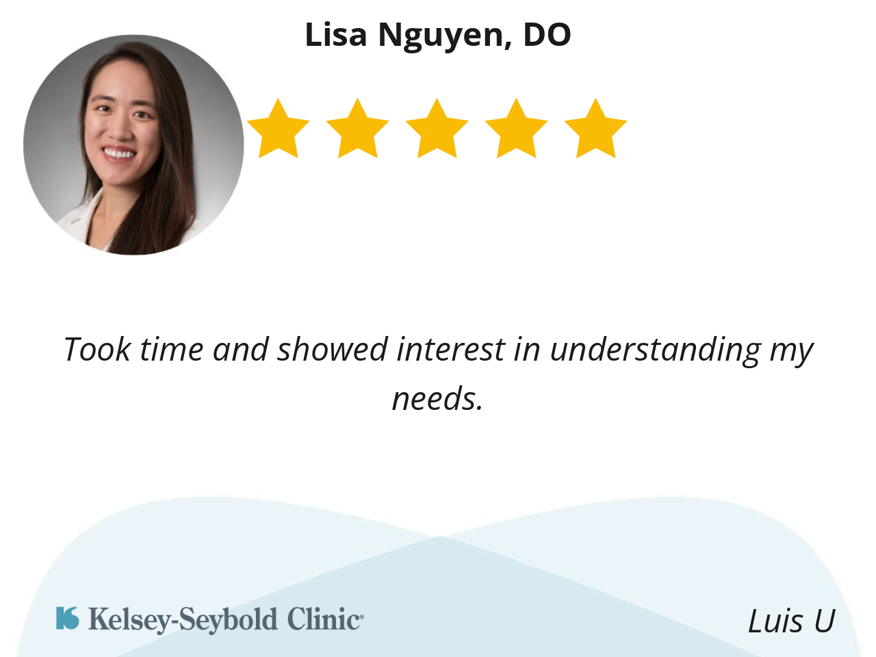This was my first visit with Doctor Abraham since my regular doctor retired and I must say that I am very happy that she was recommended by my previous doctor. She really listens and explained in a way that made it easy to understand. And the best part is I never felt rushed. I am so glad she is part of the Kelsey team of doctors
