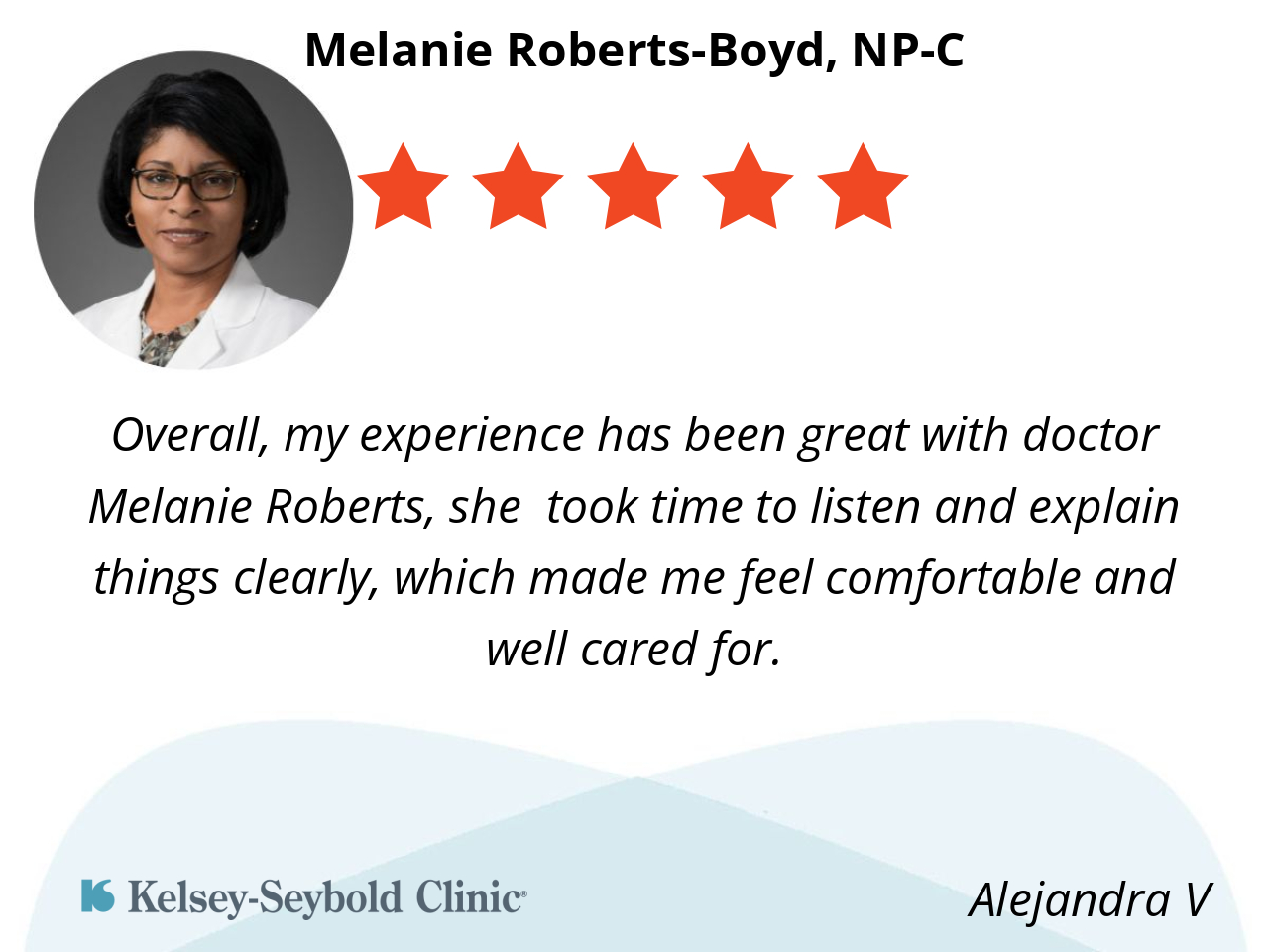 Overall, my experience has been great with doctor Melanie Roberts, she took time to listen and explain things clearly, which made me feel comfortable and well cared for.