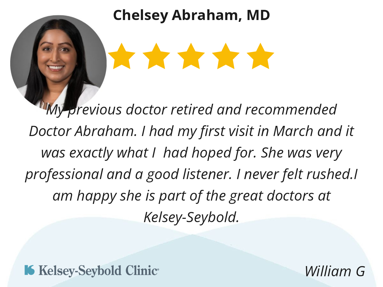 My previous doctor retired and recommended Doctor Abraham. I had my first visit in March and it was exactly what I had hoped for. She was very professional and a good listener. I never felt rushed.I am happy she is part of the great doctors at Kelsey-Seybold.