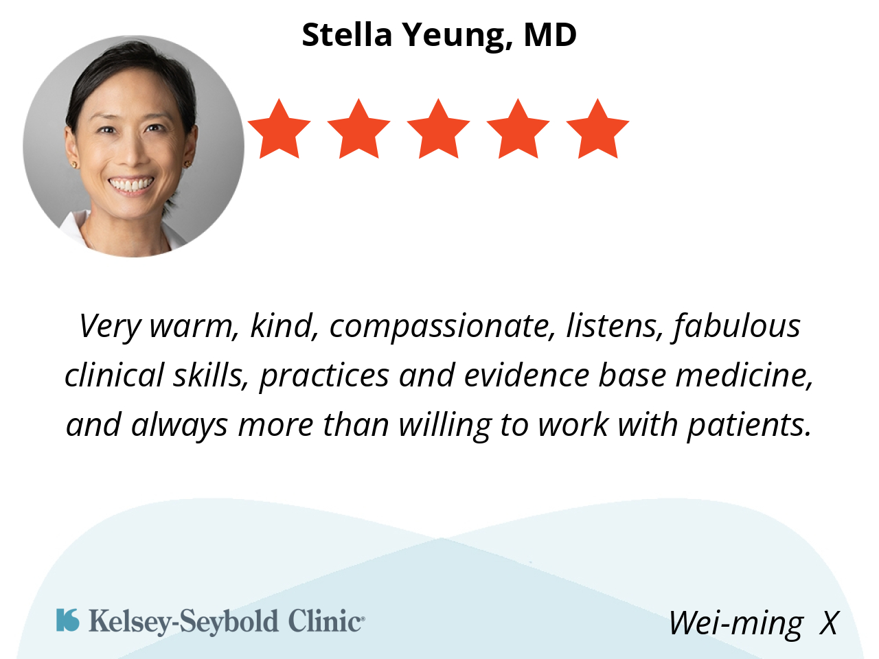 Very warm, kind, compassionate, listens, fabulous clinical skills, practices and evidence base medicine, and always more than willing to work with patients.