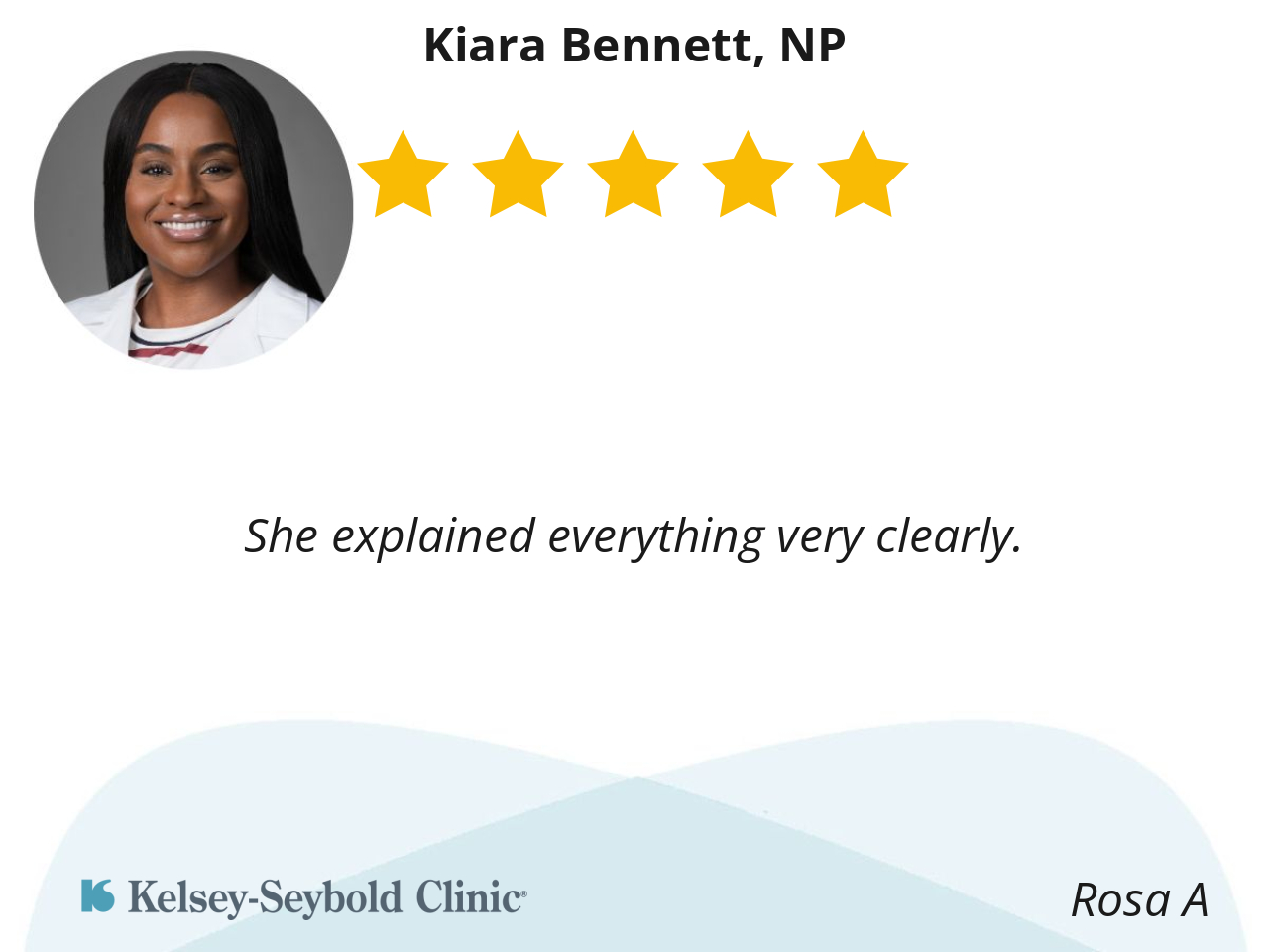 Dr. Kiara Bennett is AMAZING!! She listened to everything I said. Addressed each issue with a plan. She communicated everything clear and precisely. She provided some information and guidance on each issue and I hope to stay with her forever!! The clinic itself is a seamless operation and I really appreciate not sitting in a waiting room or office for 30 min or longer waiting for assistance. I have never waited more than 5 minutes.