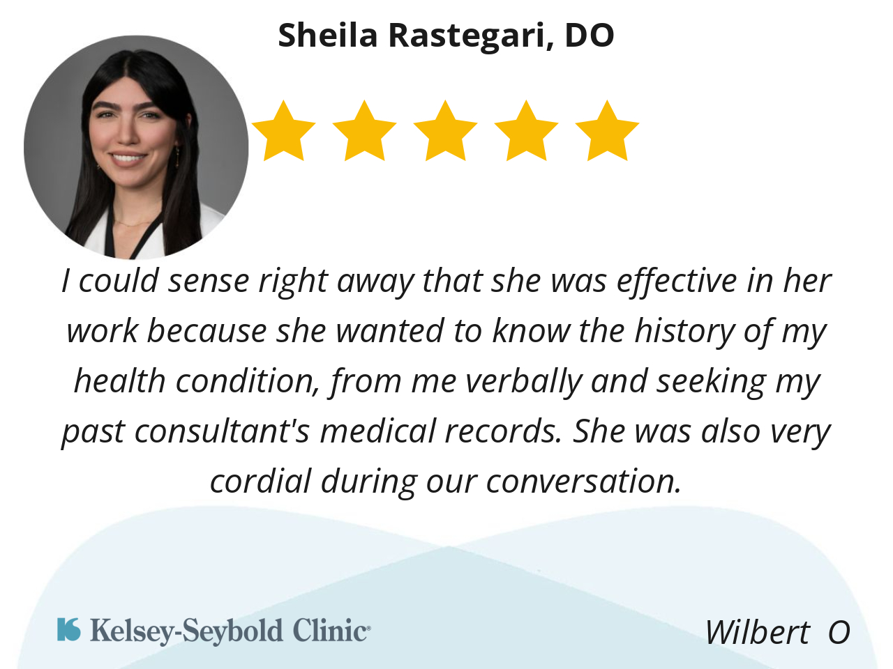 Good initial meeting. Dr. Rastegari was very thorough and answered all my questions. Didn't feel as rushed as other doctor visits.