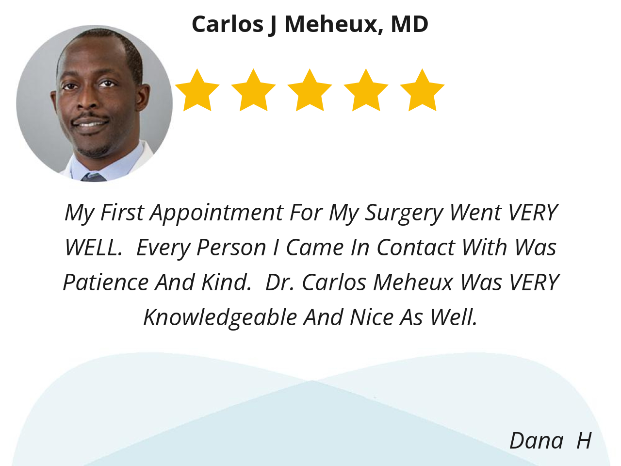 My First Appointment For My Surgery Went VERY WELL. Every Person I Came In Contact With Was Patience And Kind. Dr. Carlos Meheux Was VERY Knowledgeable And Nice As Well.