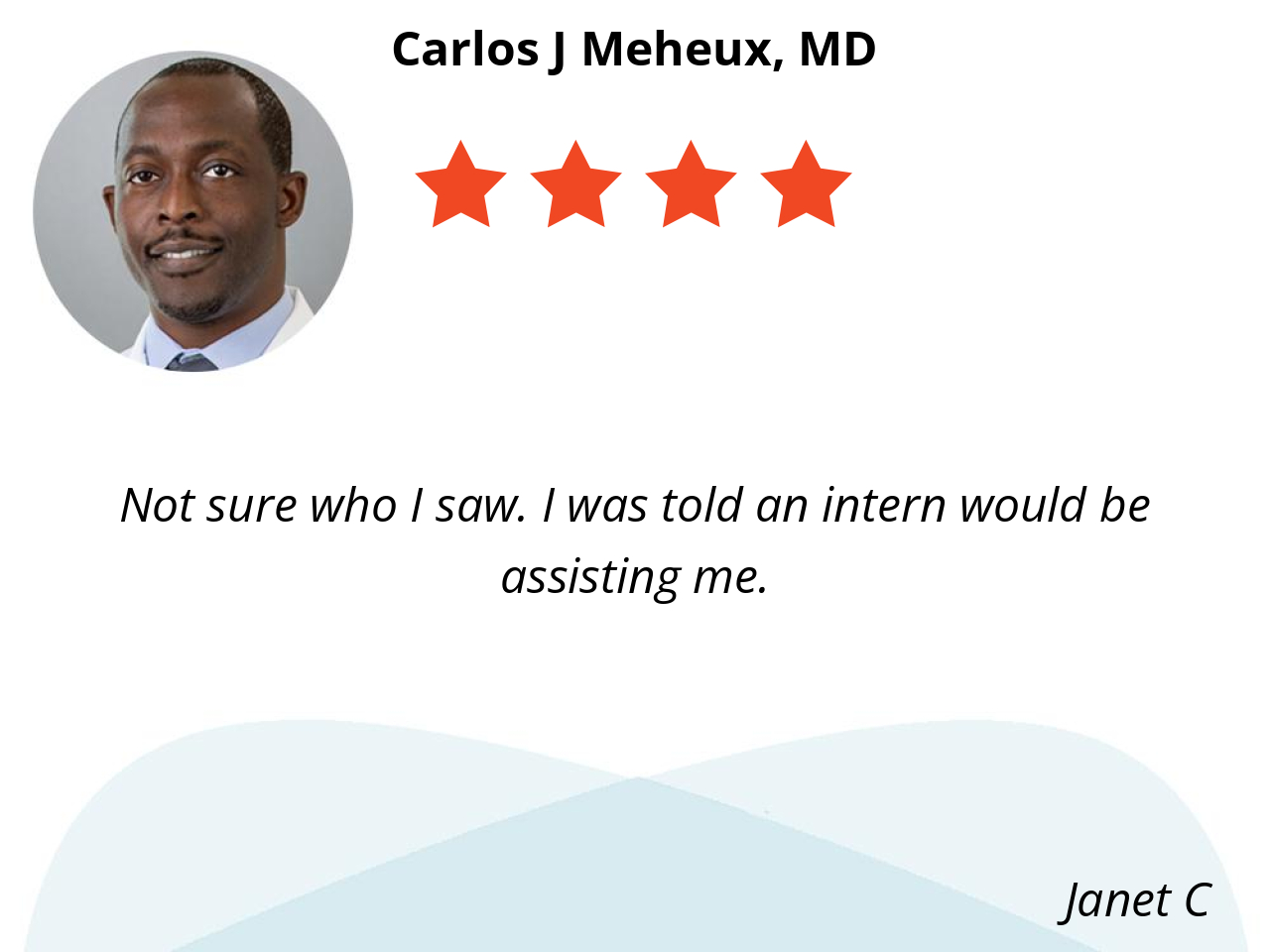 I found Dr. Meheux to be patient, kind, and friendly. He is a very knowledgeable and skilled surgeon and performed an excellent job on my total knee replacement. His support team was courteous very informative and answered all of my questions