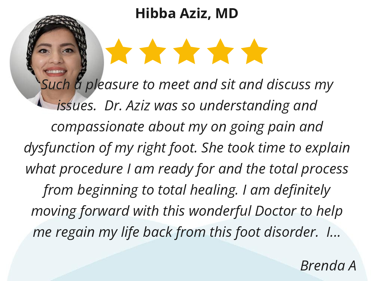 Such a pleasure to meet and sit and discuss my issues. Dr. Aziz was so understanding and compassionate about my on going pain and dysfunction of my right foot. She took time to explain what procedure I am ready for and the total process from beginning to total healing. I am definitely moving forward with this wonderful Doctor to help me regain my life back from this foot disorder. I highly recommend this Doctor
