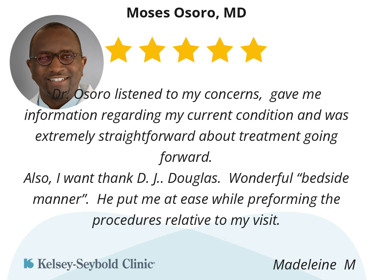Dr. Osoro was thorough in his explanations. He was very knowledgeable. I was able to explain what was going on with me, and he listened to my concerns. I didn’t feel rushed. We discussed the possible causes, and then what my options were moving forward. We talked about lifestyle changes. I can’t say enough good things about Dr. Osoro.