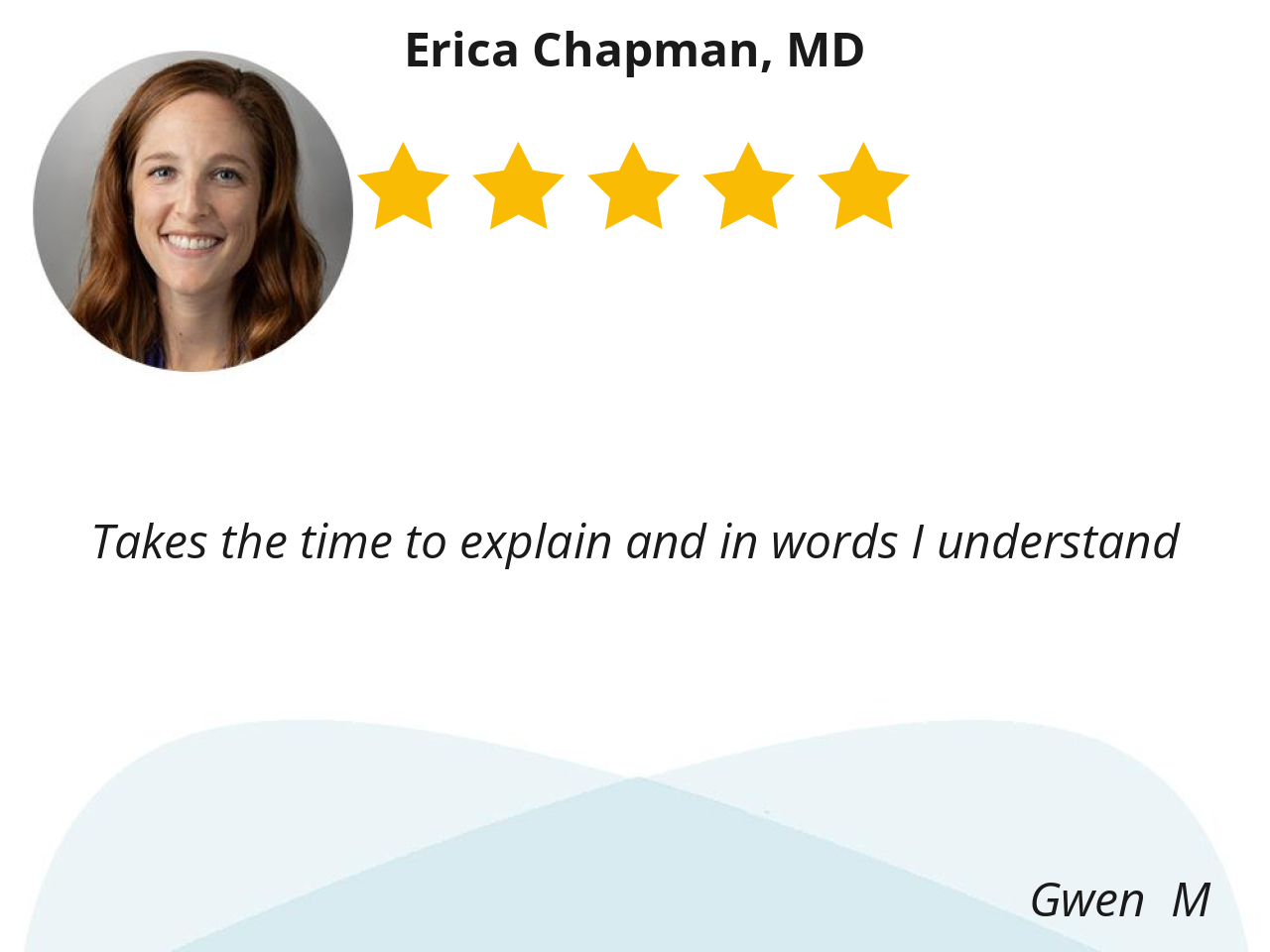 Dr. Chapman is down to earth, easy to talk to. Encourages me to share questions and concerns. Responds in a reassuring manner and gives honest feedback, never leave feeling judged. I don’t ever feel rushed during my appointments, my time is valued and respected.