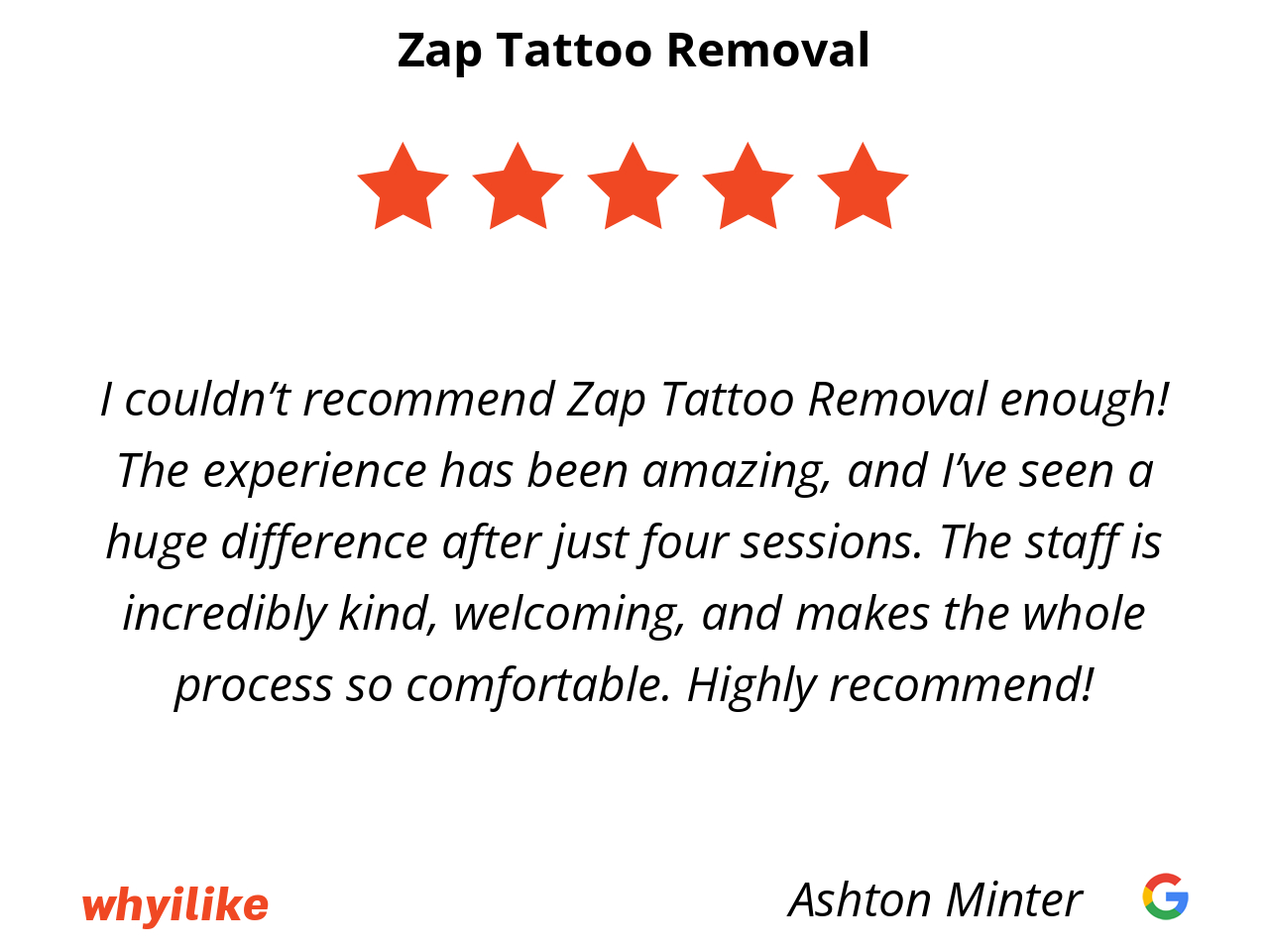 I couldn’t recommend Zap Tattoo Removal enough! The experience has been amazing, and I’ve seen a huge difference after just four sessions. The staff is incredibly kind, welcoming, and makes the whole process so comfortable. Highly recommend!