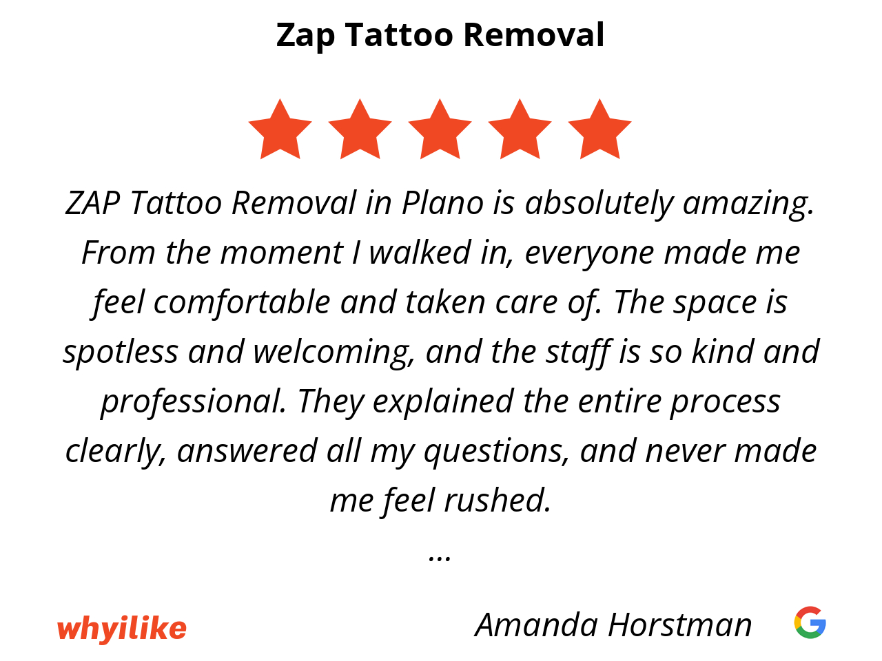 ZAP Tattoo Removal in Plano is absolutely amazing. From the moment I walked in, everyone made me feel comfortable and taken care of. The space is spotless and welcoming, and the staff is so kind and professional. They explained the entire process clearly, answered all my questions, and never made me feel rushed.