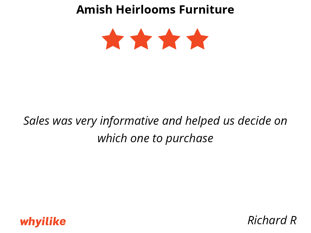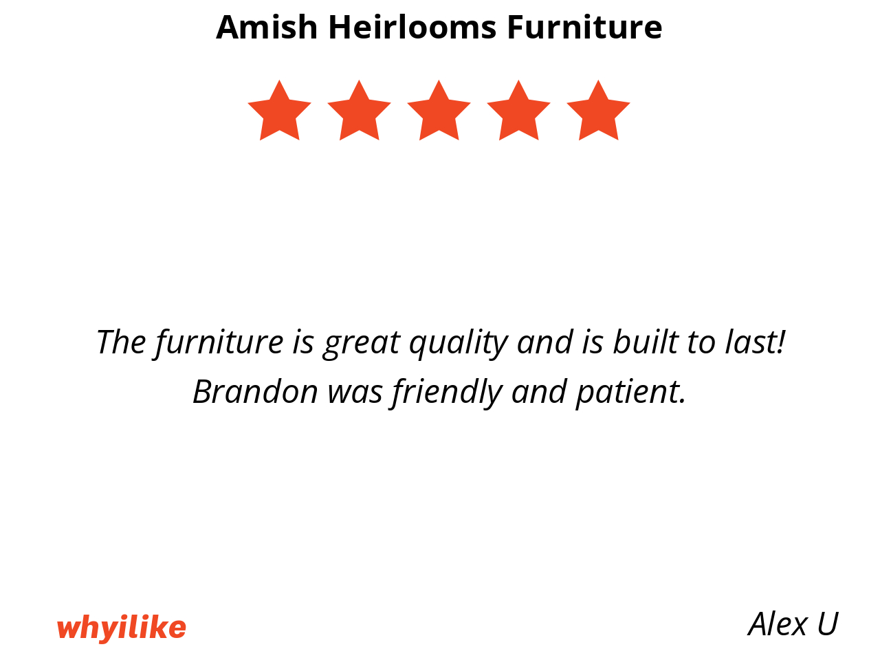 The customer service is excellent at Amish Heirlooms Furniture. Alexander greeted us at the door and allowed us to browse the store, but was available for questions. His knowledge of the pieces and availability of custom orders with wood and stain options was very helpful.