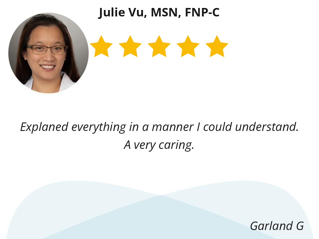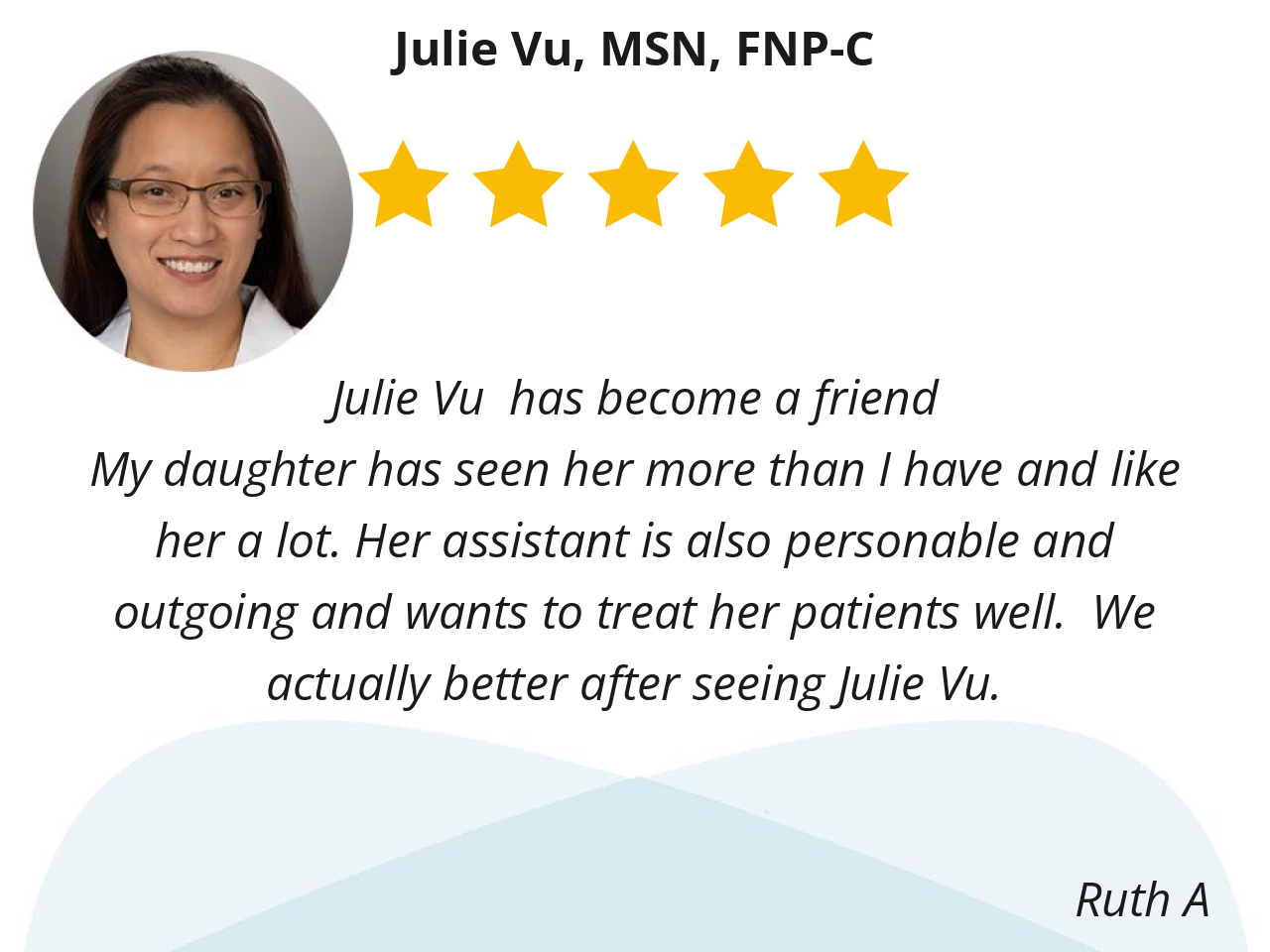 I cannot say enough good things about my FNP, Julie Vu. Providers like her are rare to find these days. She truly cares about her patients’ well-being, takes the time to listen, and goes above and beyond to address their needs. Her compassion, dedication, and professionalism have gained my trust, and I know I’m in excellent hands with her. Julie Vu will forever be my primary care provider, and I highly recommend her to anyone seeking exceptional care. She is truly one of a kind!