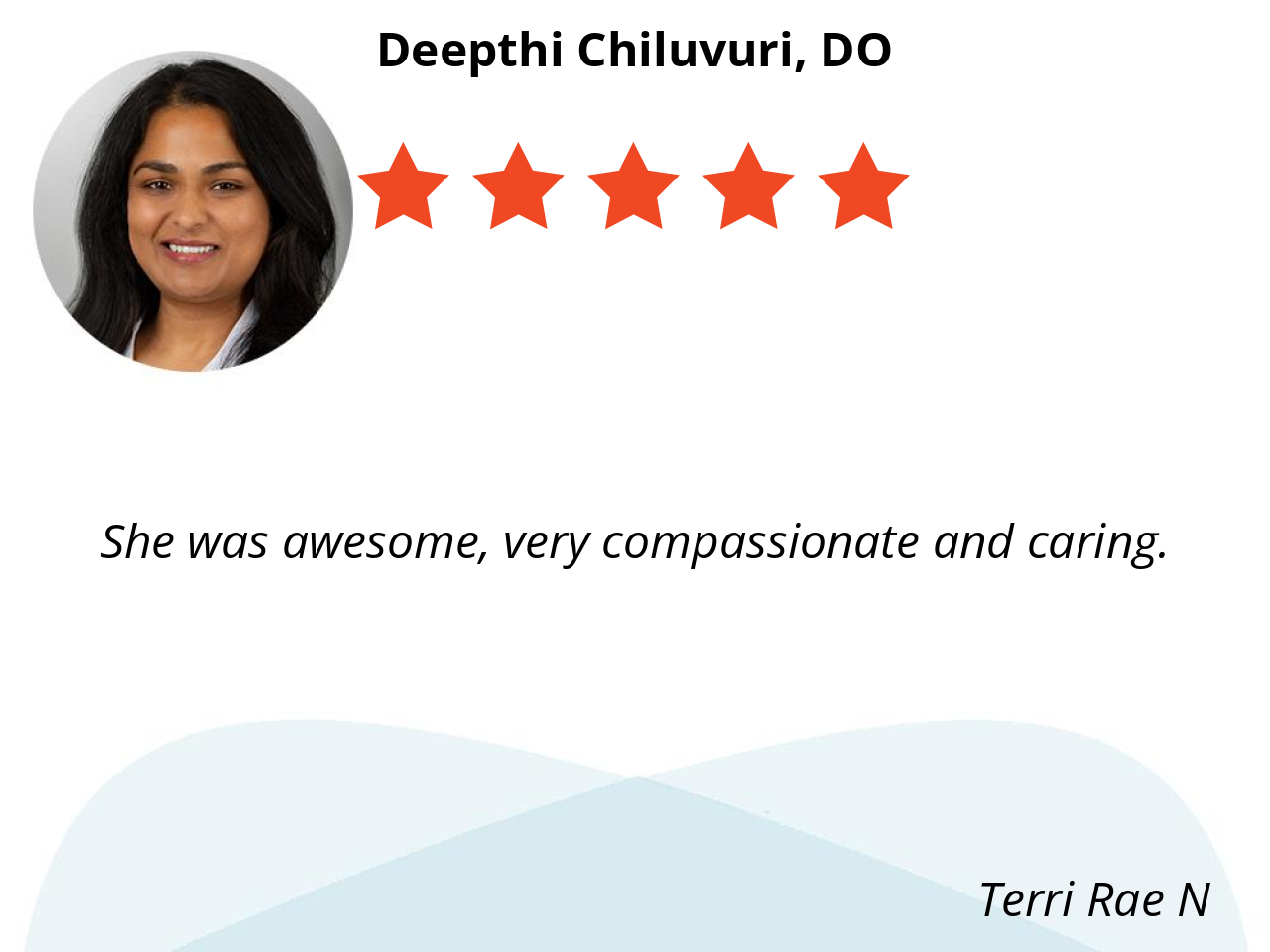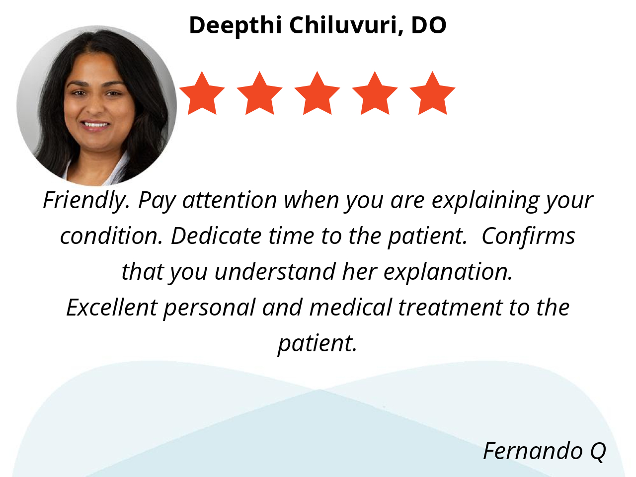 I like Dr. Chiluvuri very much. She listens to my concerns and gives her professsional opinion after examination. She is very friendly and patient care oriented.