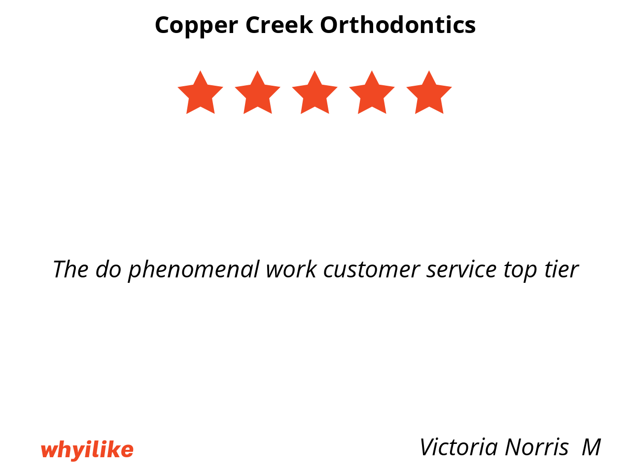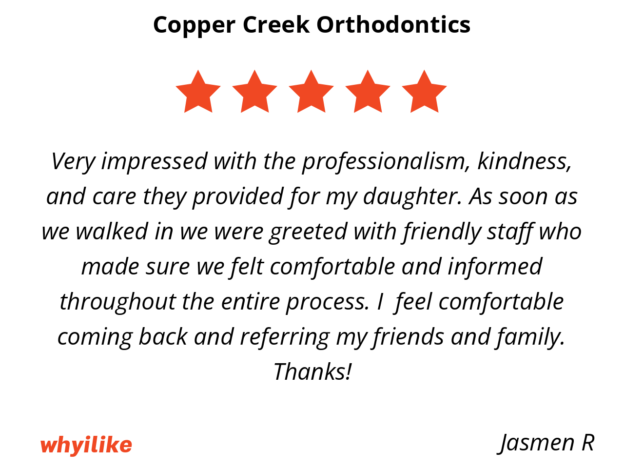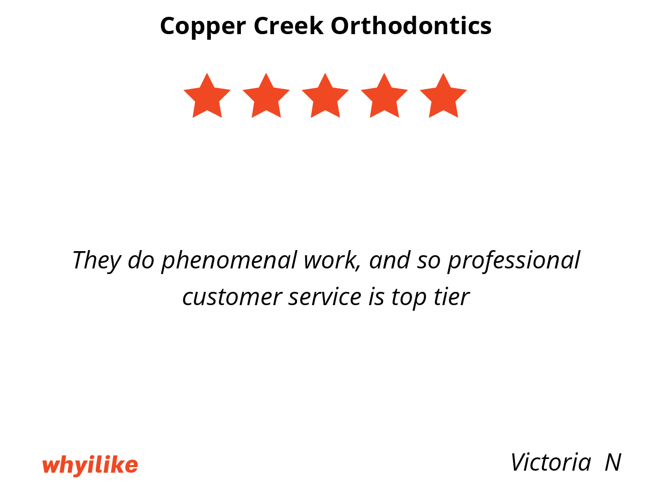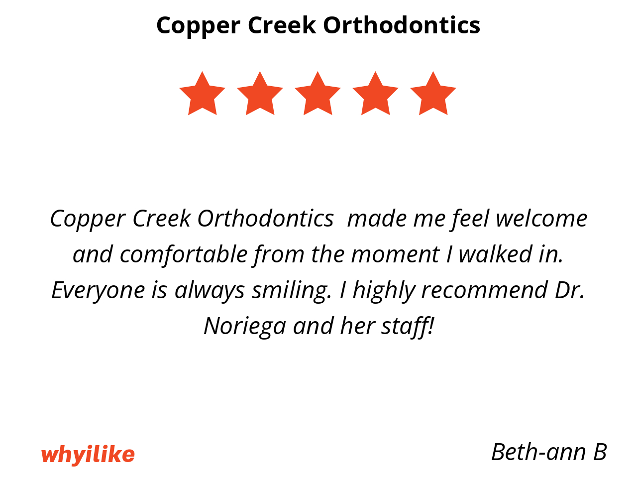 Copper Creek Orthodontics made me feel welcome and comfortable from the moment I walked in. Everyone is always smiling. I highly recommend Dr. Noriega and her staff!