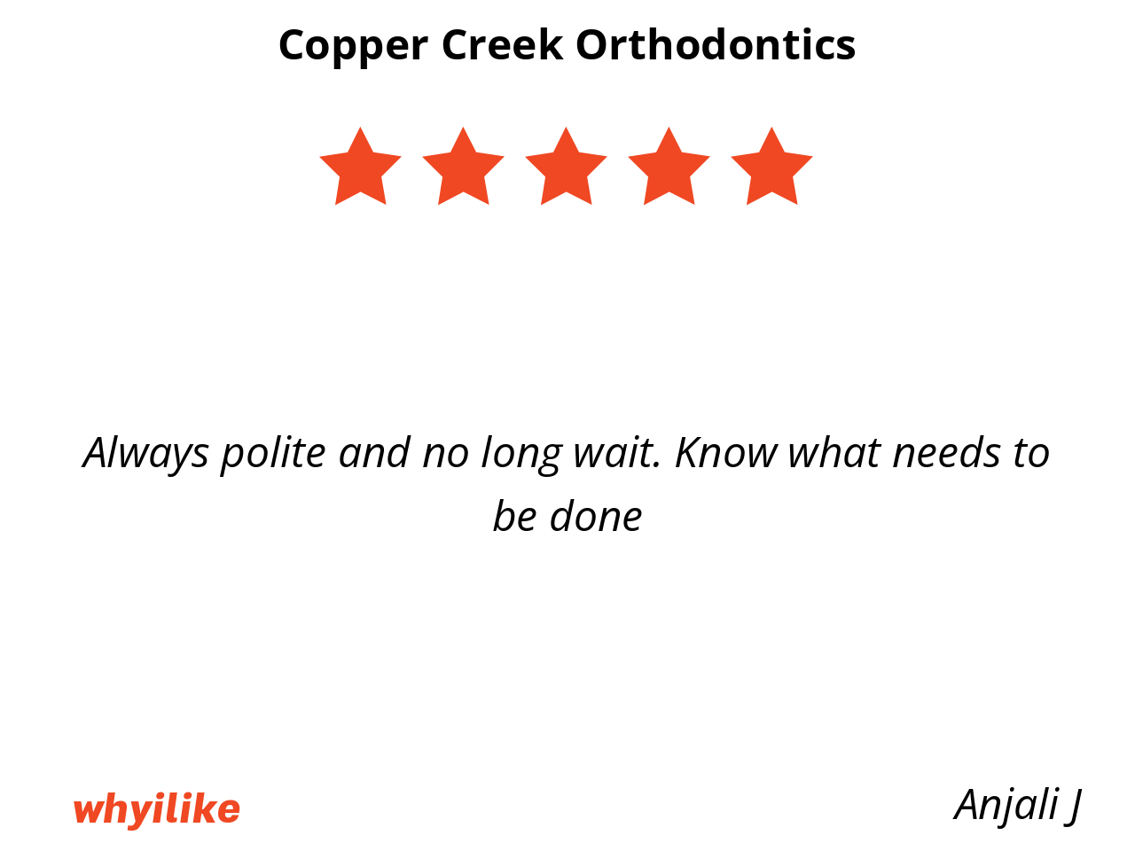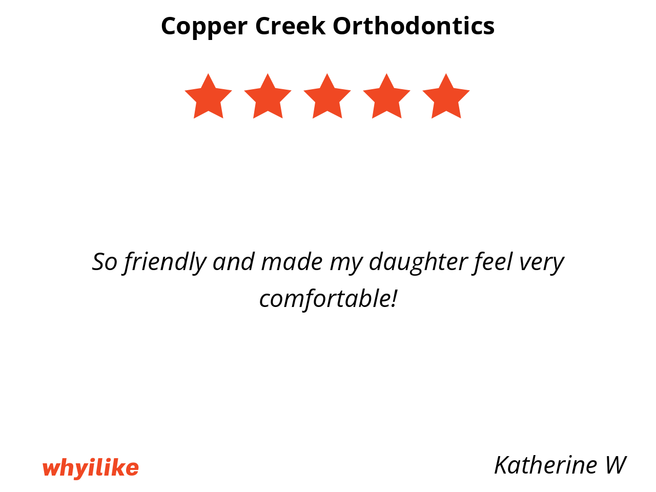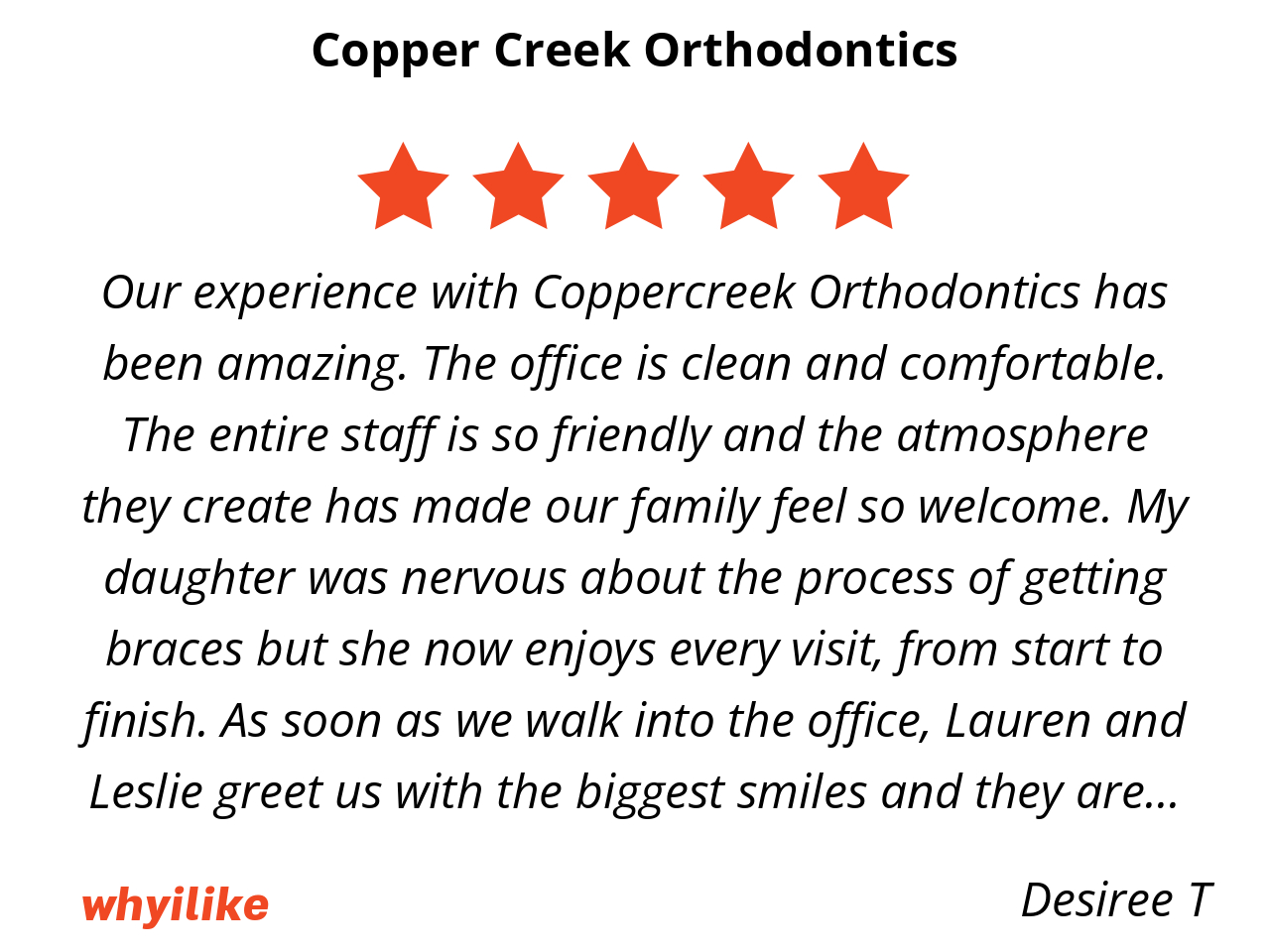 Our experience with Coppercreek Orthodontics has been amazing. The office is clean and comfortable. The entire staff is so friendly and the atmosphere they create has made our family feel so welcome. My daughter was nervous about the process of getting braces but she now enjoys every visit, from start to finish. As soon as we walk into the office, Lauren and Leslie greet us with the biggest smiles and they are always so sweet to my daughter. Holly has always been so friendly and helpful in answering any finance or insurance questions we have. We’ve never experienced long wait times and each visit has been enjoyable. Dr. Noriega and Janelle are so kind and great at explaining every step to ensure my daughter feels comfortable at each visit. I’m so grateful to their entire team and would recommend this office to anyone in need of an Orthodontist.