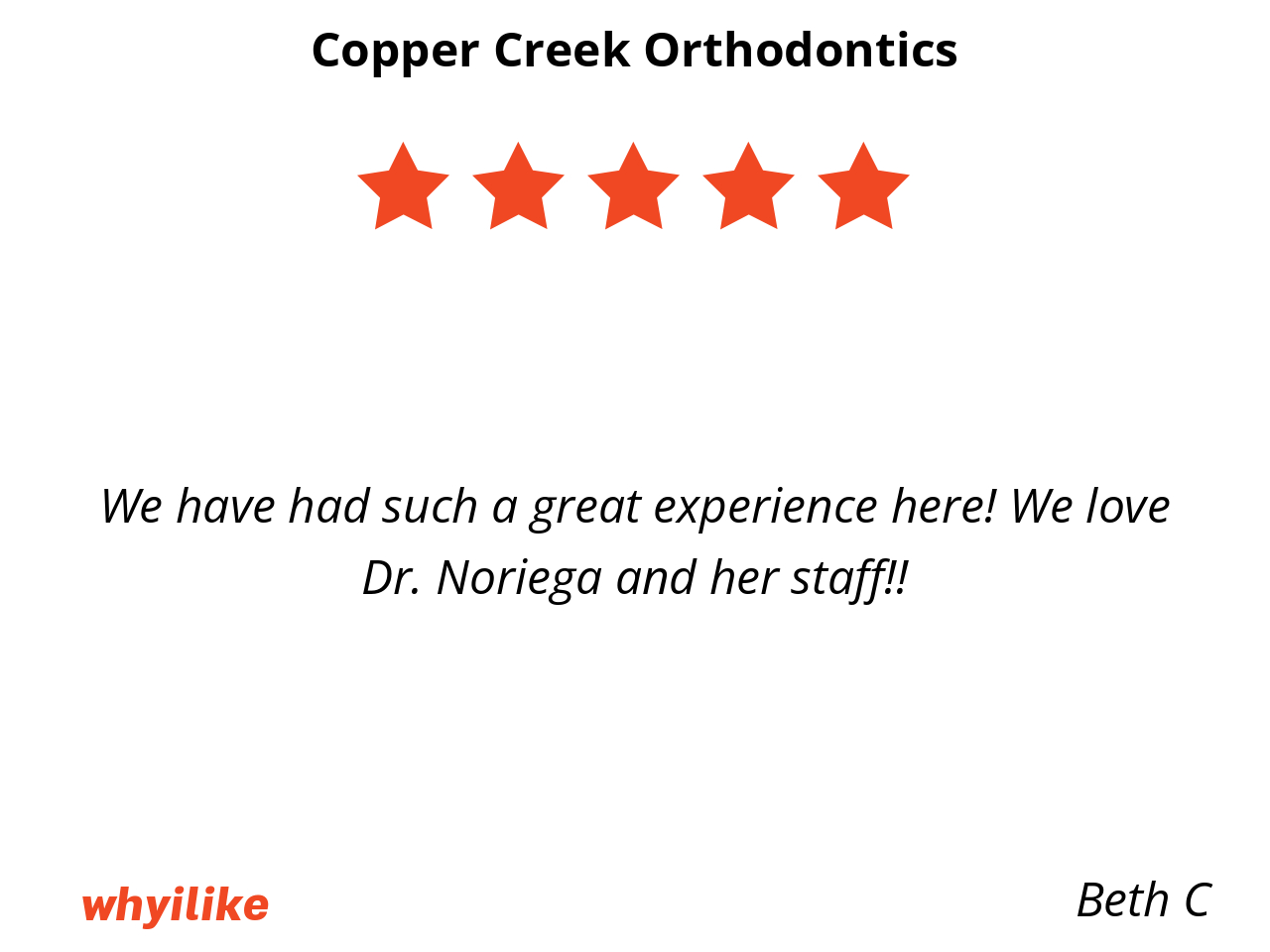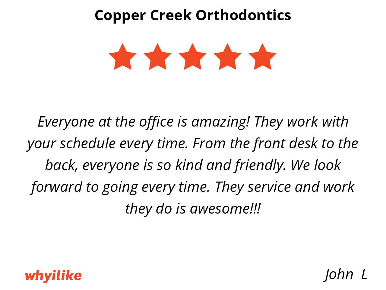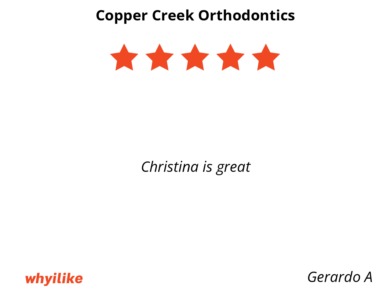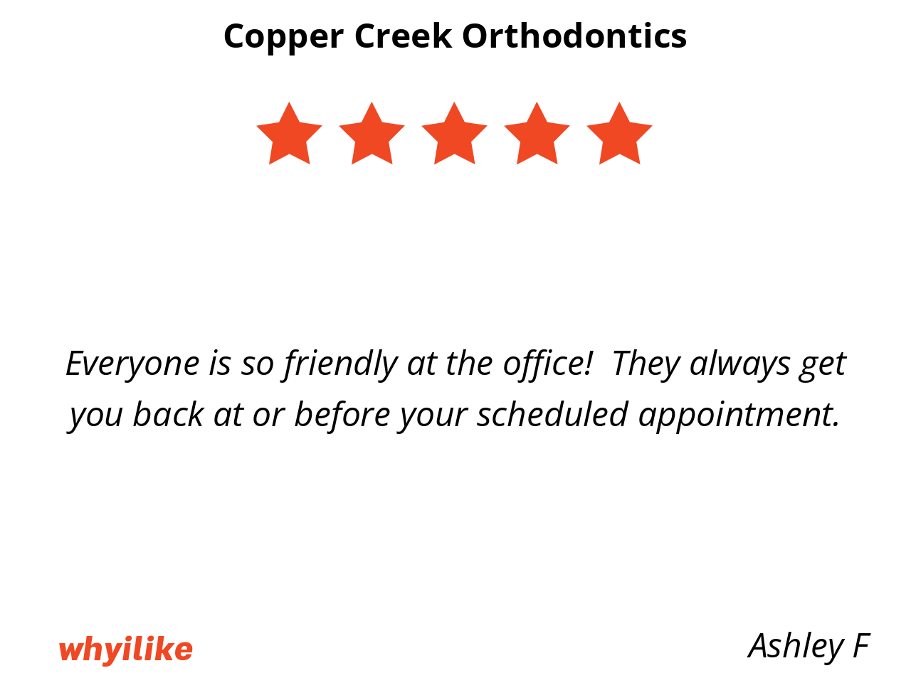 Our experience with Coppercreek Orthodontics has been amazing. The office is clean and comfortable. The entire staff is so friendly and the atmosphere they create has made our family feel so welcome. My daughter was nervous about the process of getting braces but she now enjoys every visit, from start to finish. As soon as we walk into the office, Lauren and Leslie greet us with the biggest smiles and they are always so sweet to my daughter. Holly has always been so friendly and helpful in answering any finance or insurance questions we have. We’ve never experienced long wait times and each visit has been enjoyable. Dr. Noriega and Janelle are so kind and great at explaining every step to ensure my daughter feels comfortable at each visit. I’m so grateful to their entire team and would recommend this office to anyone in need of an Orthodontist.