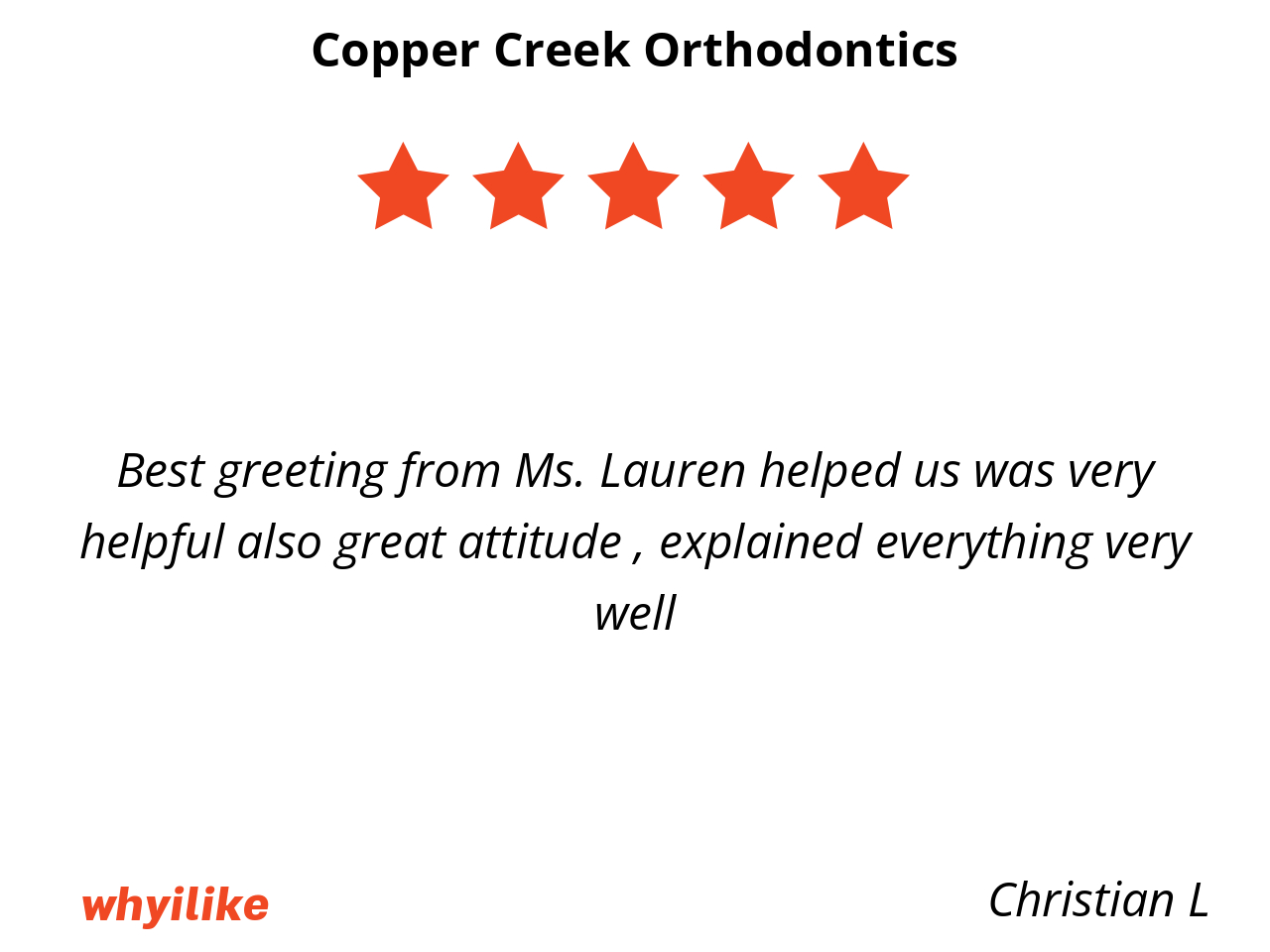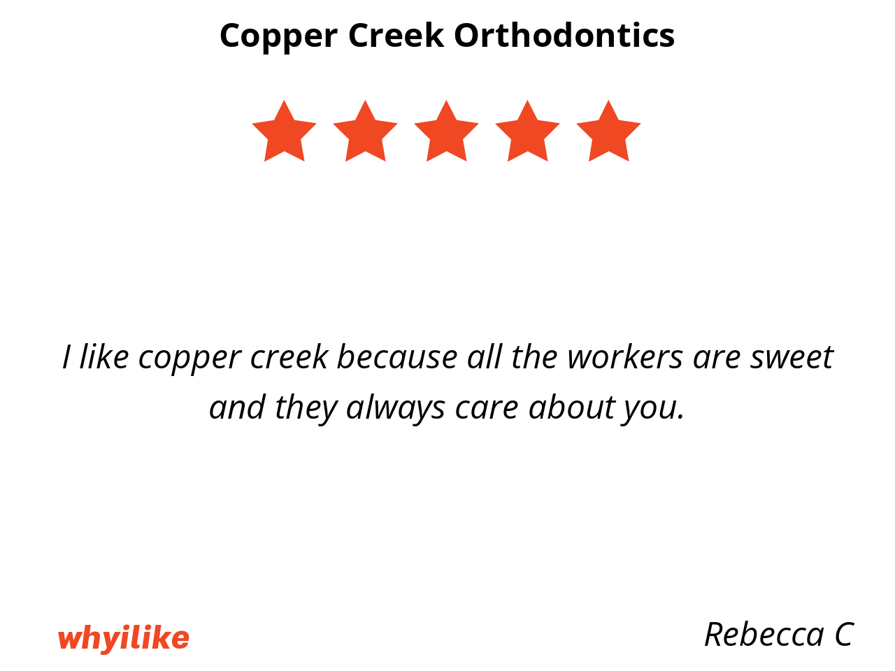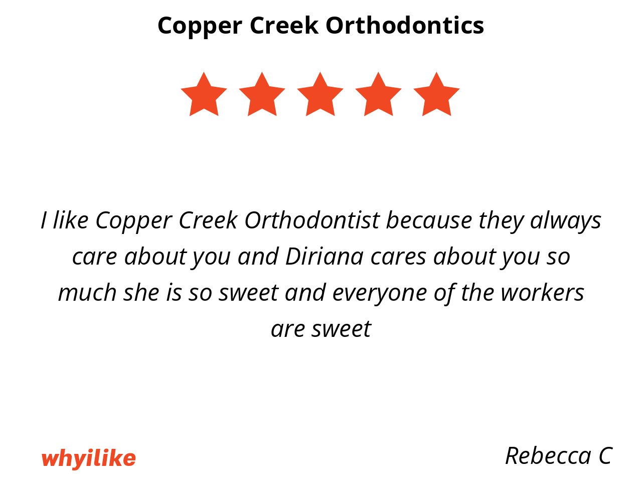 I like Copper Creek Orthodontist because they always care about you and Diriana cares about you so much she is so sweet and everyone of the workers are sweet