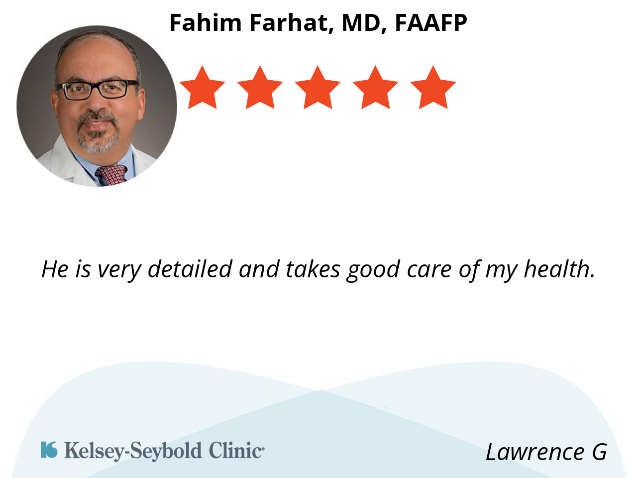 Dr. Farhat is knowledgeable and encourages his patients to be mindful of their health. He communicates test results and other information with understanding and patience, breaking down the medical jargon. I also like the way he shows empathy and relates to his patients as real human beings.