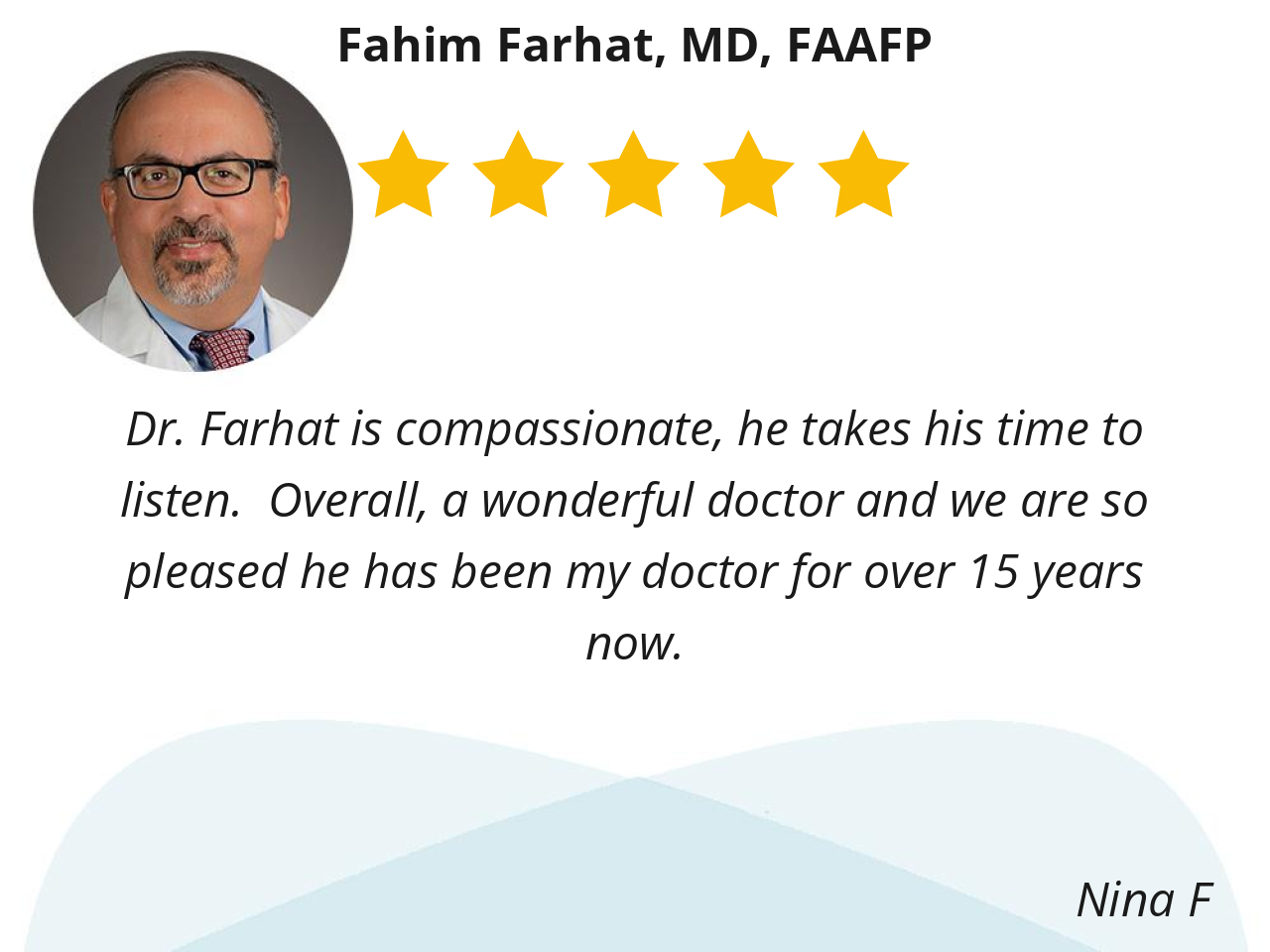 Dr. Farhat is compassionate, he takes his time to listen. Overall, a wonderful doctor and we are so pleased he has been my doctor for over 15 years now.