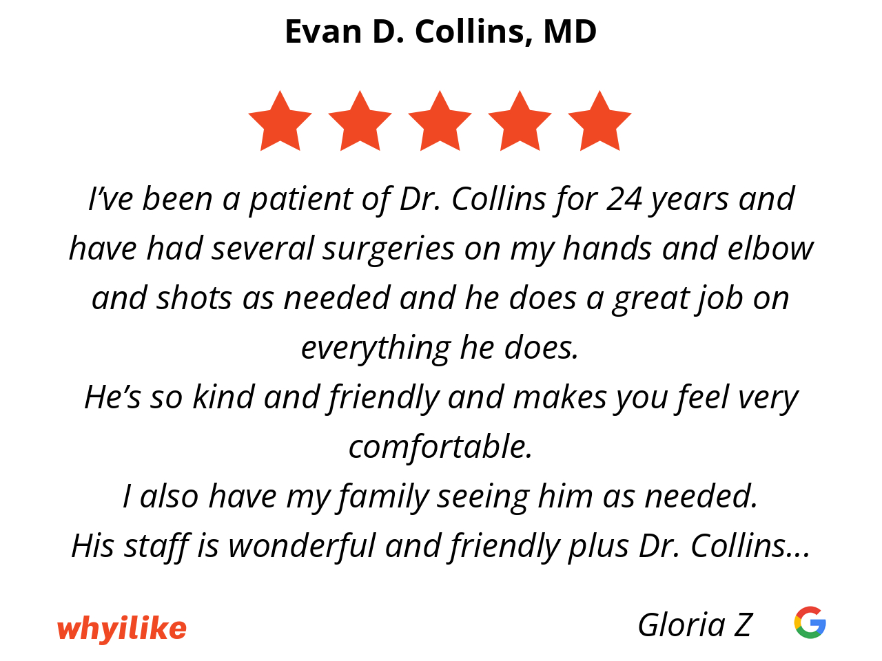 I’ve been a patient of Dr. Collins for 24 years and have had several surgeries on my hands and elbow and shots as needed and he does a great job on everything he does.