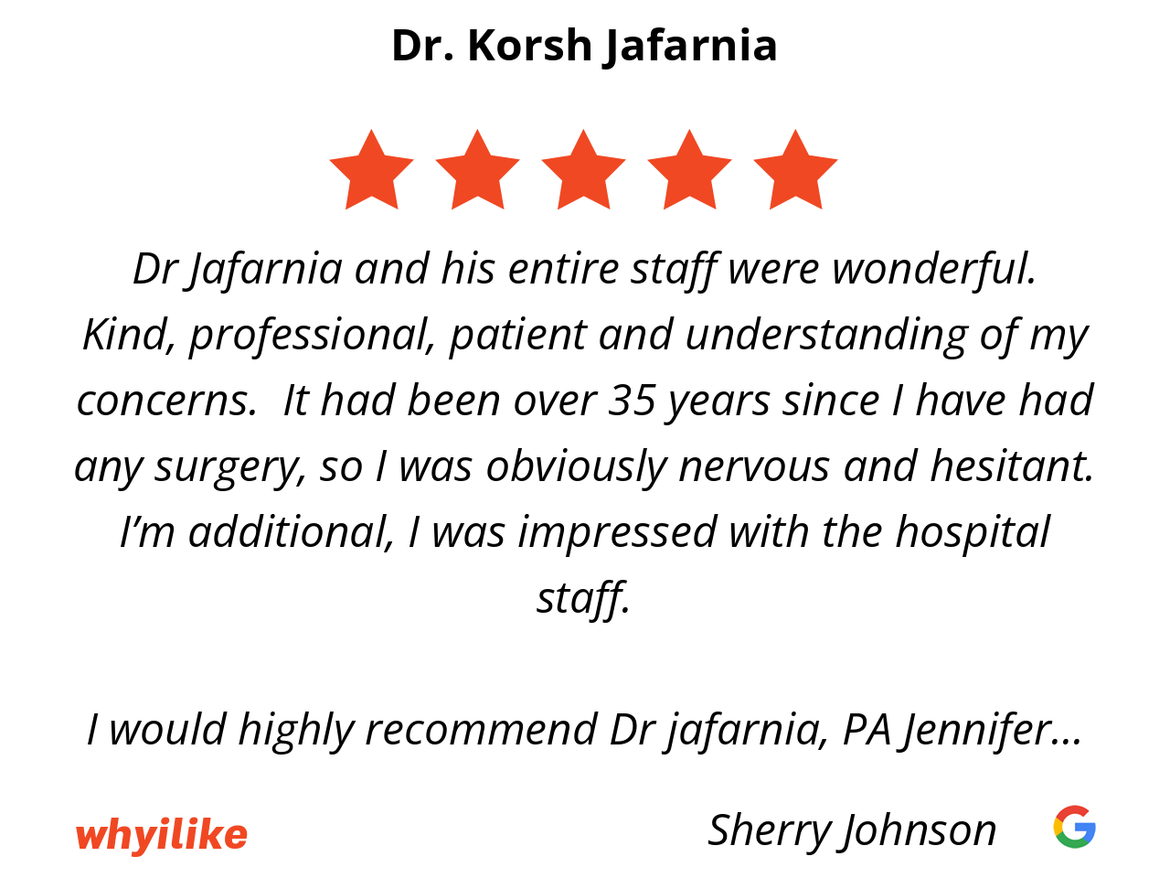 Dr Jafarnia and his entire staff were wonderful. Kind, professional, patient and understanding of my concerns. It had been over 35 years since I have had any surgery, so I was obviously nervous and hesitant. I’m additional, I was impressed with the hospital staff.