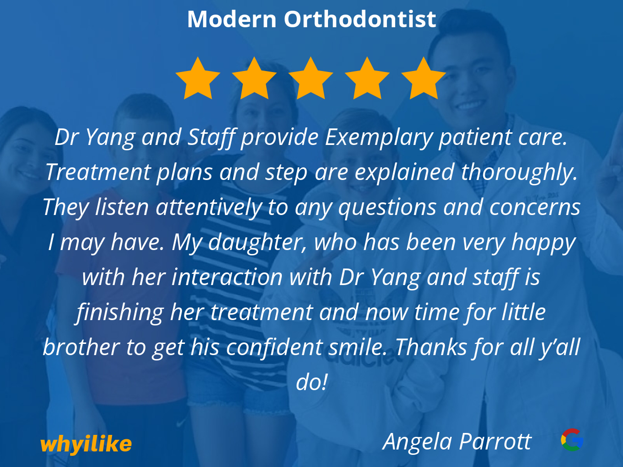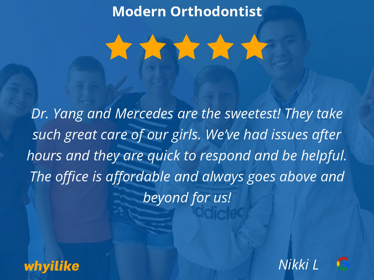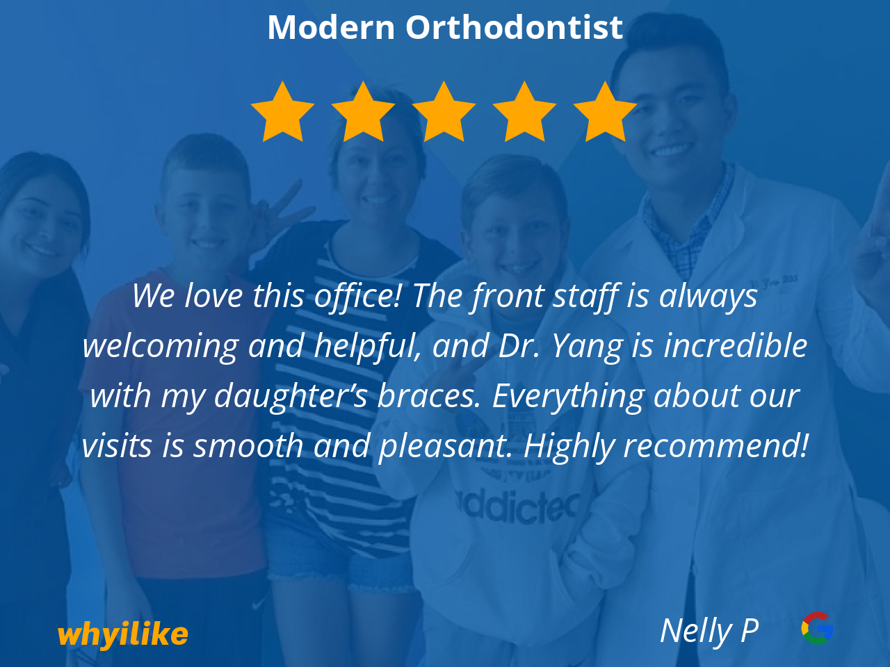 We were referred to Modern Orthodontist by our pediatric dentist. Dr. Yang and his staff are such a blessing. We are 6+ months into braces for both of my kids and we have absolutely zero complaints so far. My kids have no complaints. We look forward to our appointments. It’s easy to schedule. They communicate extremely well. We always know what’s happening and what the plan is which I appreciate very much. They always make sure there are no issues before we leave. We love everyone there. If you’re in need of an orthodontist, look no further.
