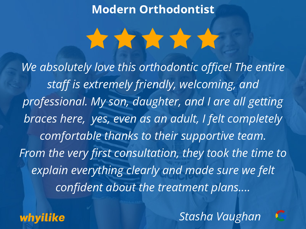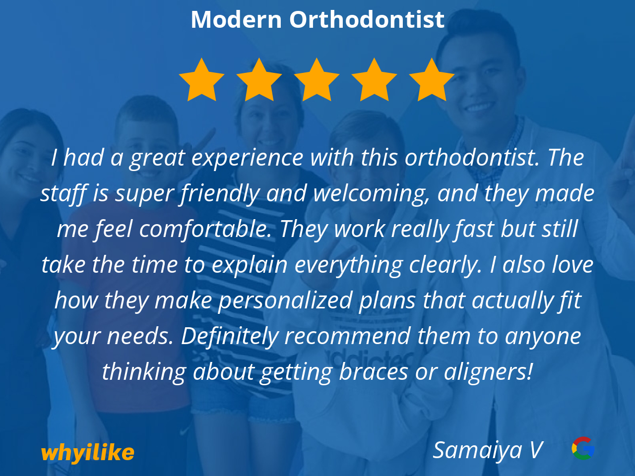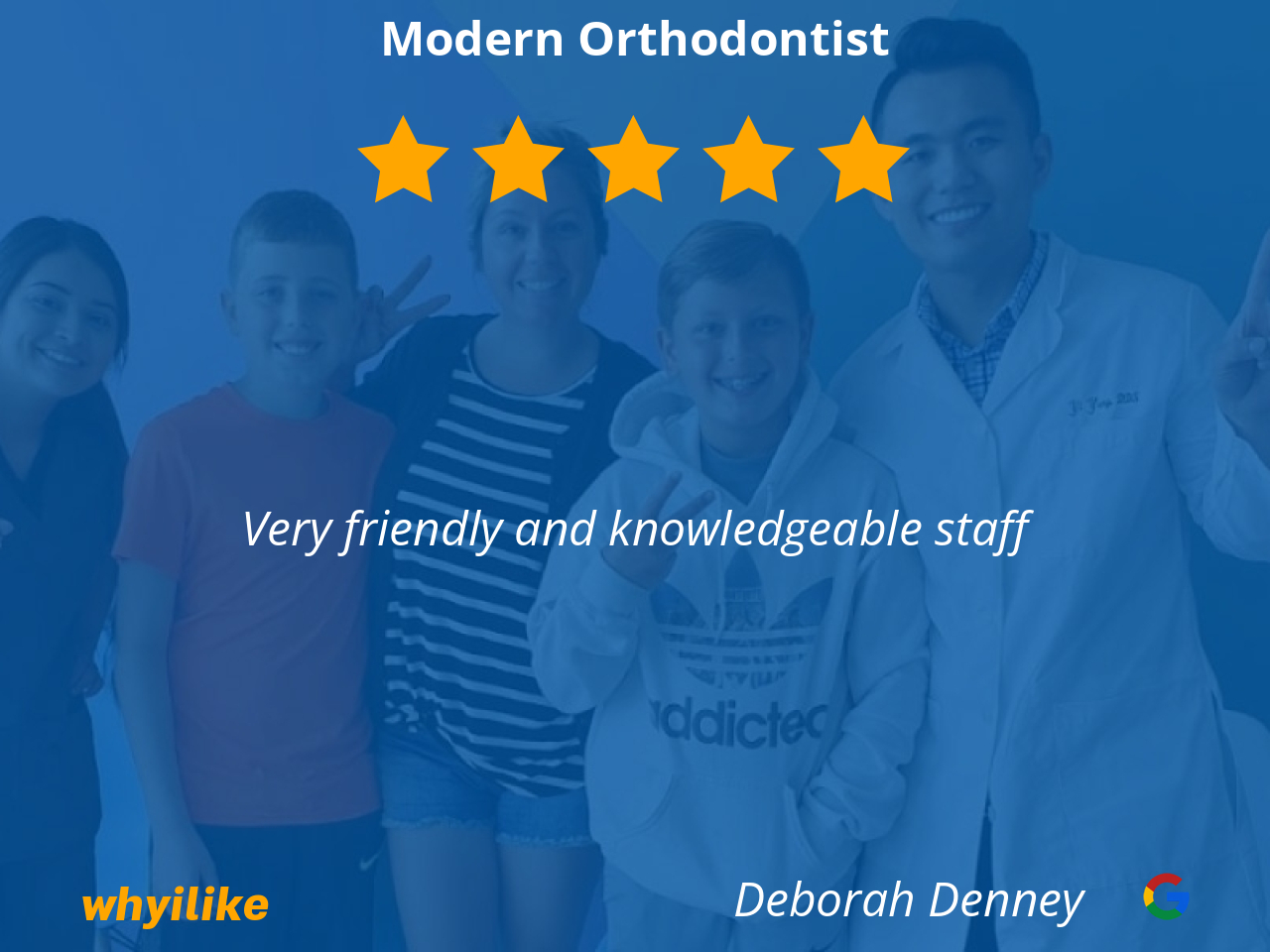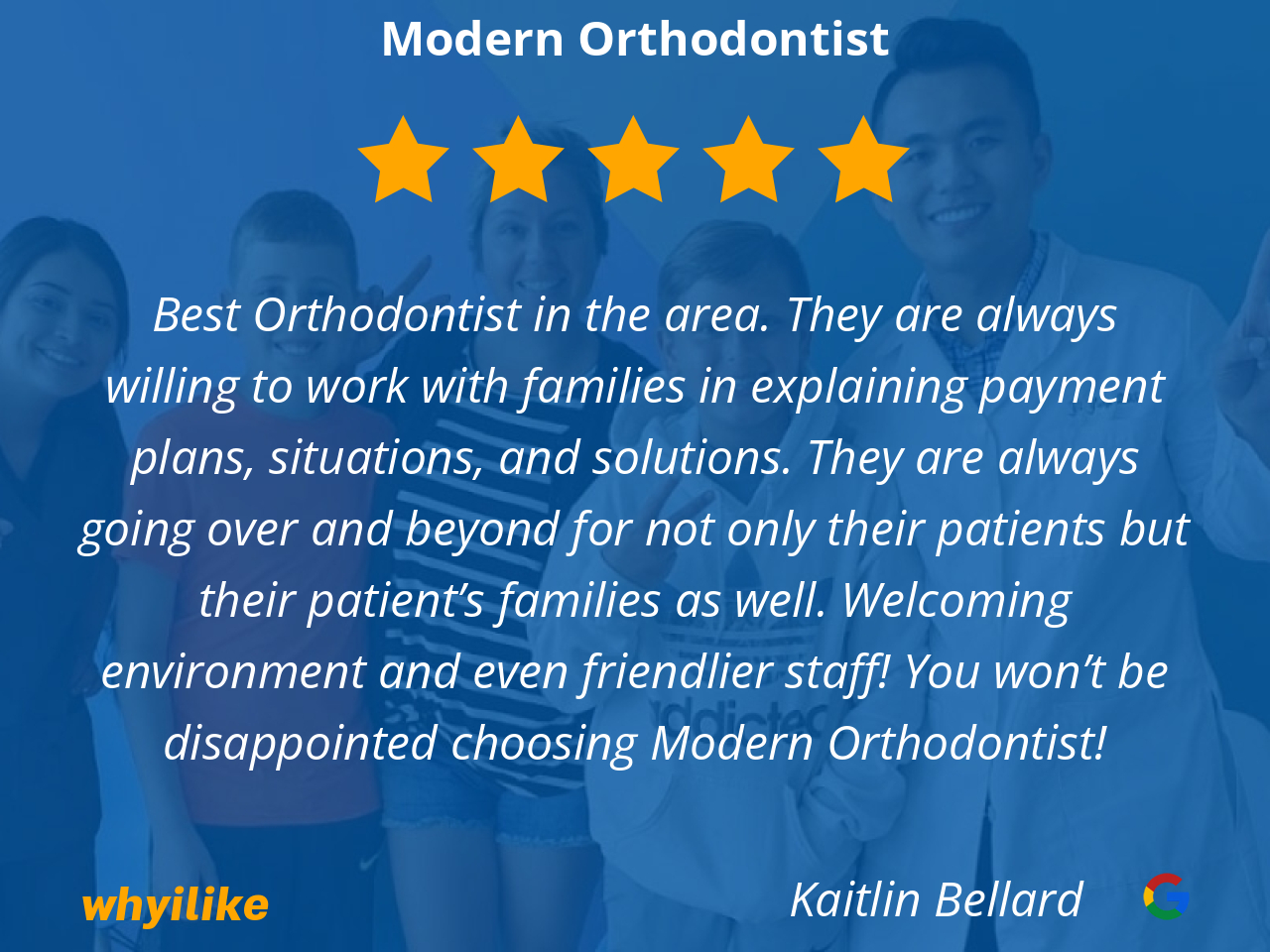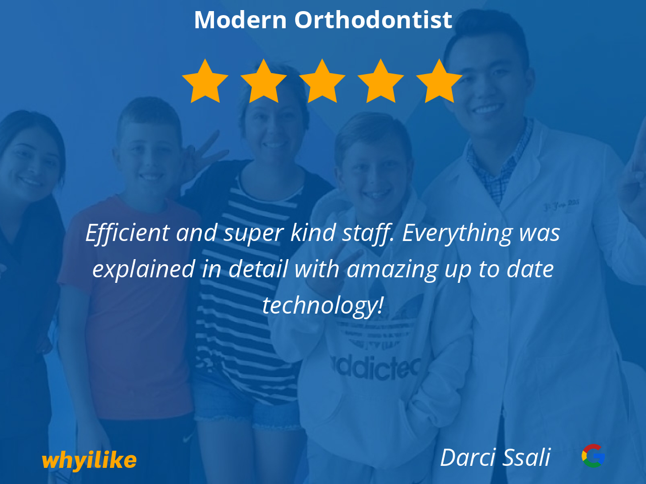 Best Orthodontist in the area. They are always willing to work with families in explaining payment plans, situations, and solutions. They are always going over and beyond for not only their patients but their patient’s families as well. Welcoming environment and even friendlier staff! You won’t be disappointed choosing Modern Orthodontist!