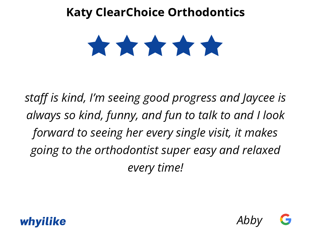 staff is kind, I’m seeing good progress and Jaycee is always so kind, funny, and fun to talk to and I look forward to seeing her every single visit, it makes going to the orthodontist super easy and relaxed every time!