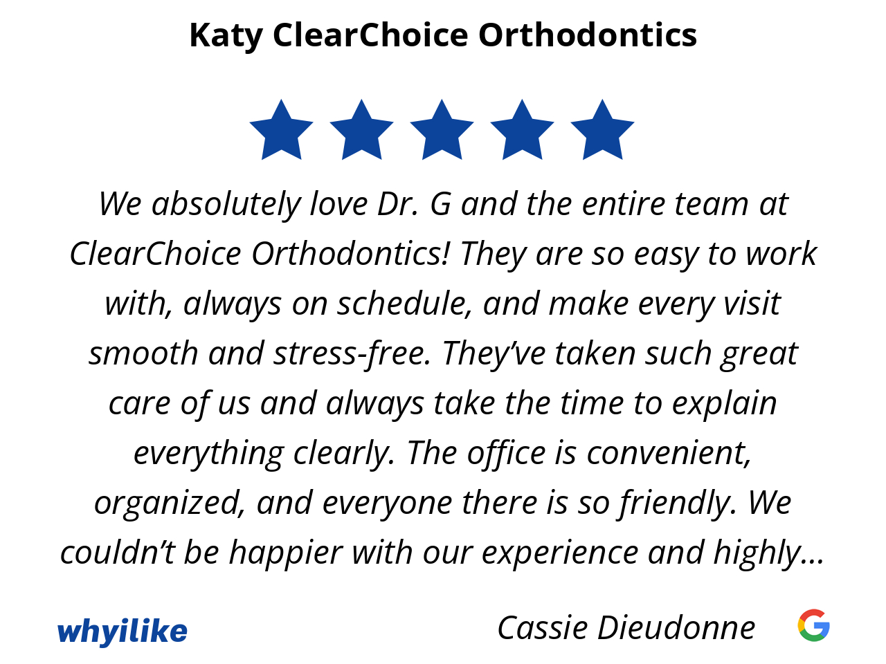 We absolutely love Dr. G and the entire team at ClearChoice Orthodontics! They are so easy to work with, always on schedule, and make every visit smooth and stress-free. They’ve taken such great care of us and always take the time to explain everything clearly. The office is convenient, organized, and everyone there is so friendly. We couldn’t be happier with our experience and highly recommend them!