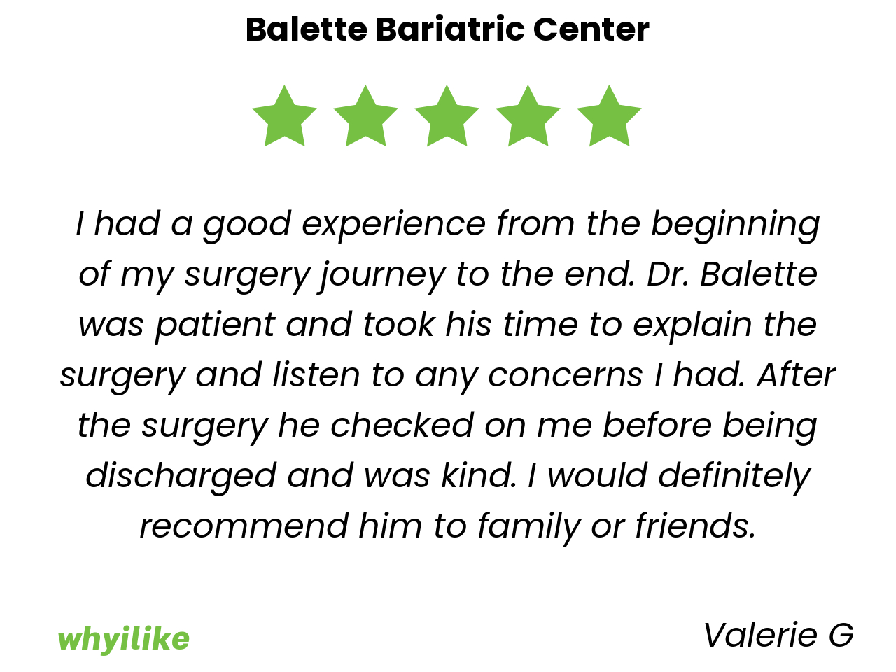 I met Dr. Balette 11yrs ago. He helped save my life. The past 2yrs, he has performed 2 surgeries on me. I love Dr. Balette & his staff. He has a very good bedside manner. And walked me through every step of my procedure. He’s a blessing to all he comes in contact with. May his services continue to heal and make healthy. Big shout out to the world’s best bariatric surgeon.