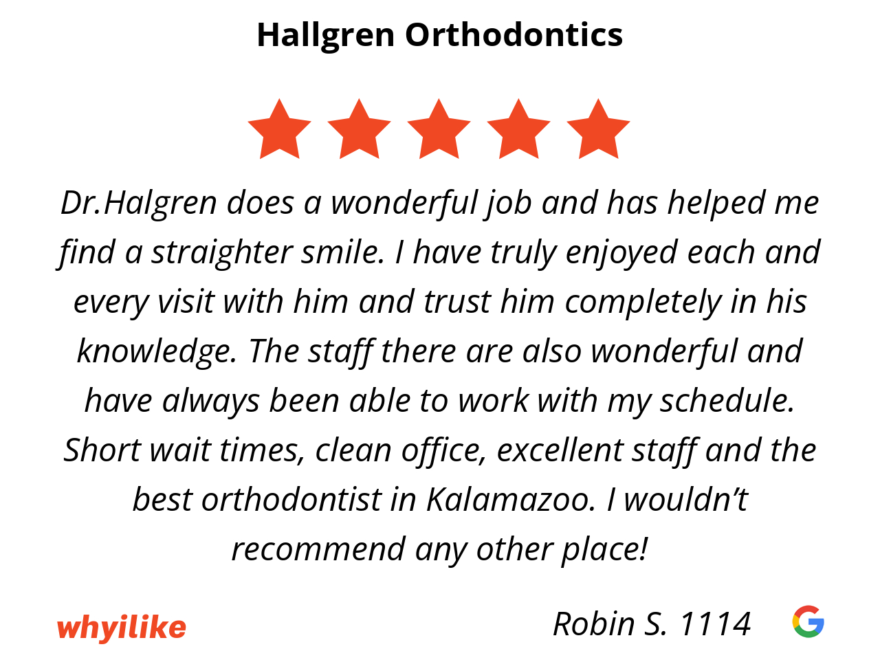 Dr.Halgren does a wonderful job and has helped me find a straighter smile. I have truly enjoyed each and every visit with him and trust him completely in his knowledge. The staff there are also wonderful and have always been able to work with my schedule. Short wait times, clean office, excellent staff and the best orthodontist in Kalamazoo. I wouldn’t recommend any other place!