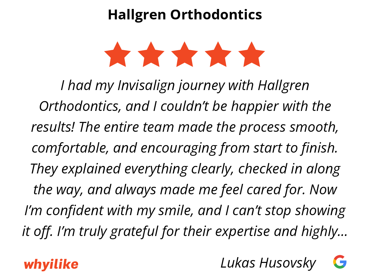 I had my Invisalign journey with Hallgren Orthodontics, and I couldn’t be happier with the results! The entire team made the process smooth, comfortable, and encouraging from start to finish. They explained everything clearly, checked in along the way, and always made me feel cared for. Now I’m confident with my smile, and I can’t stop showing it off. I’m truly grateful for their expertise and highly recommend them to anyone considering orthodontic treatment!