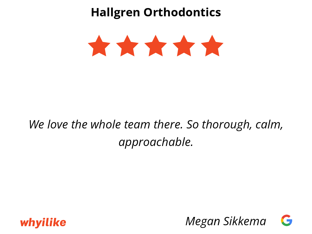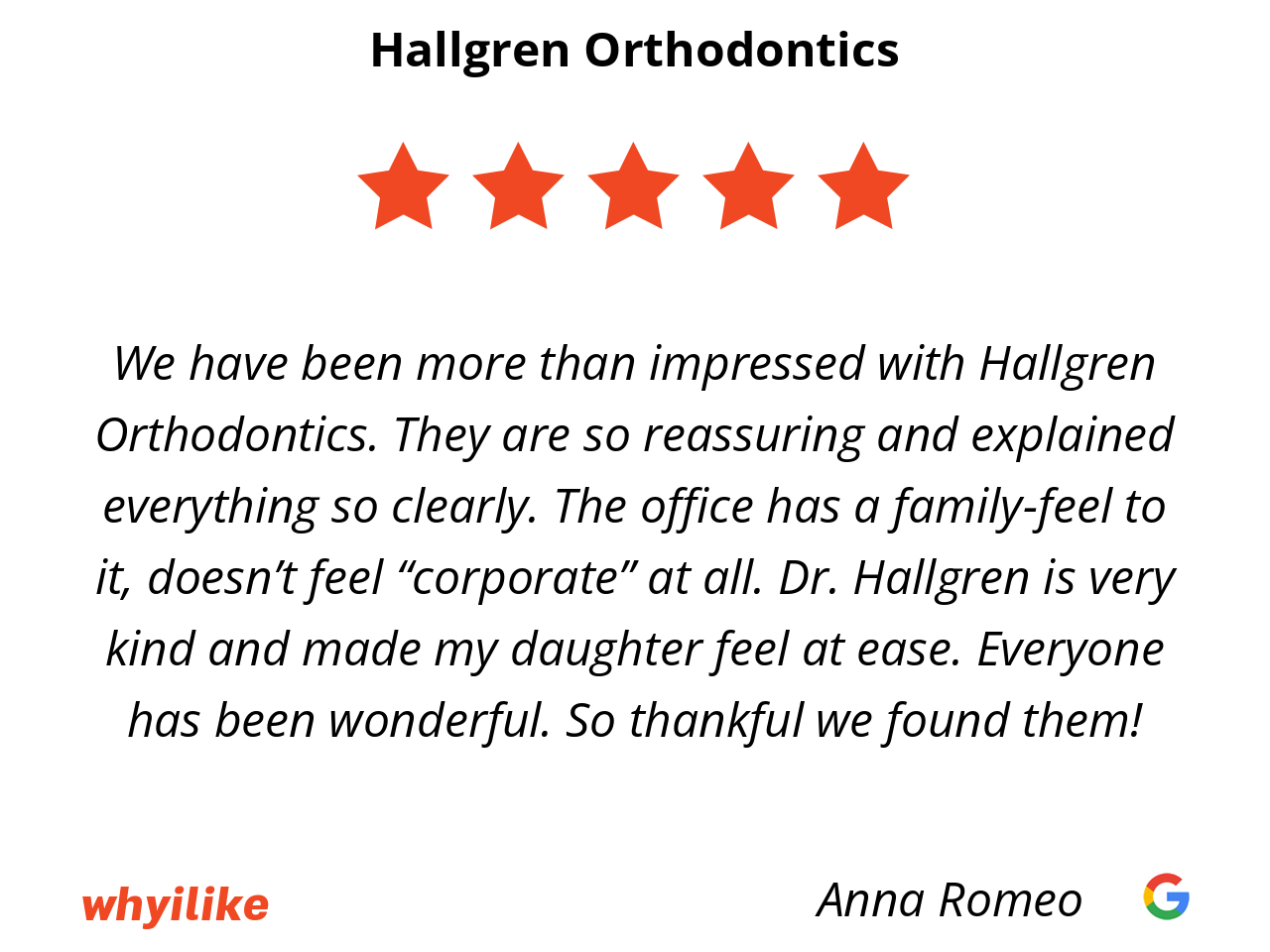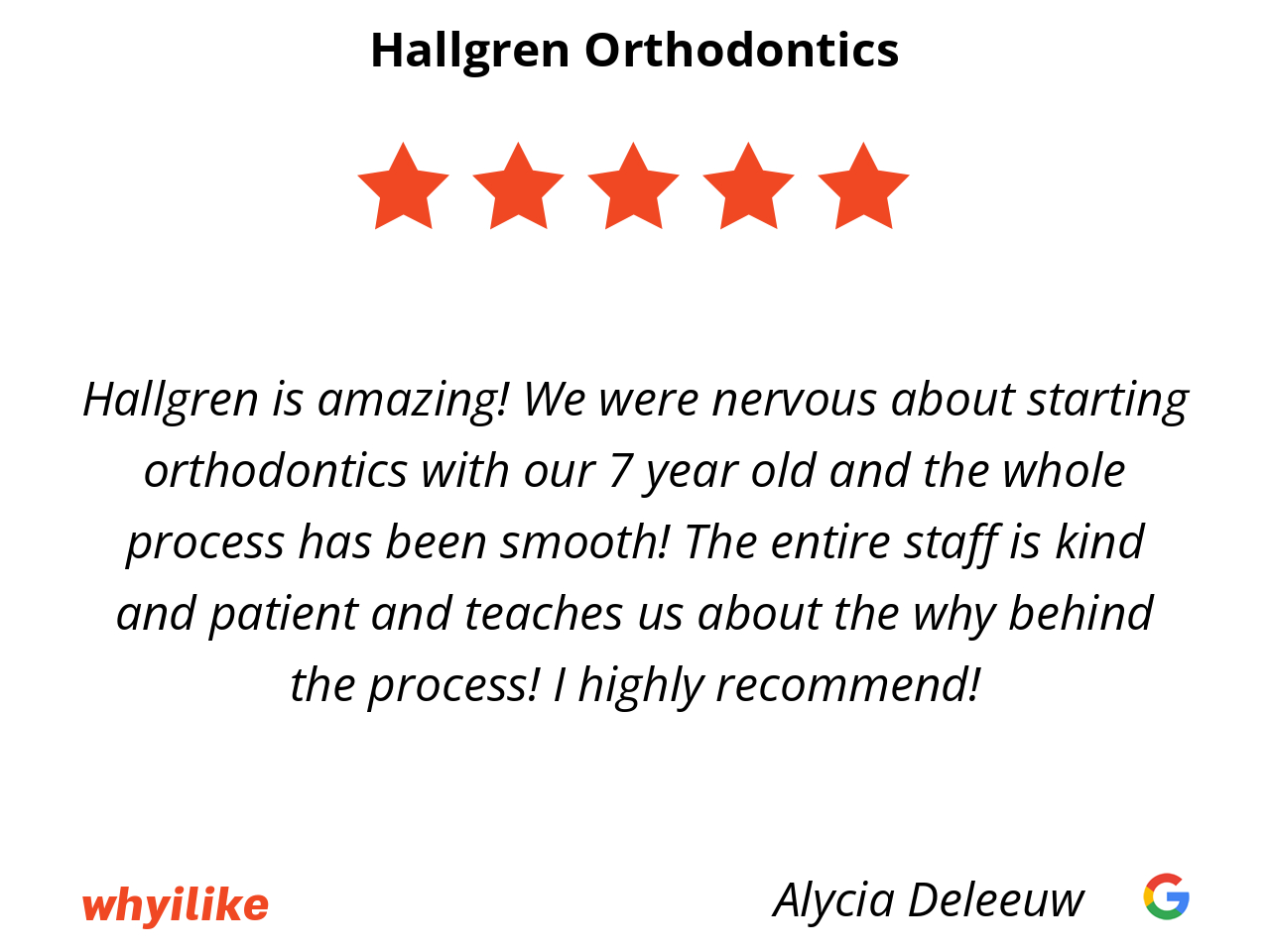 We have been more than impressed with Hallgren Orthodontics. They are so reassuring and explained everything so clearly. The office has a family-feel to it, doesn’t feel “corporate” at all. Dr. Hallgren is very kind and made my daughter feel at ease. Everyone has been wonderful. So thankful we found them!