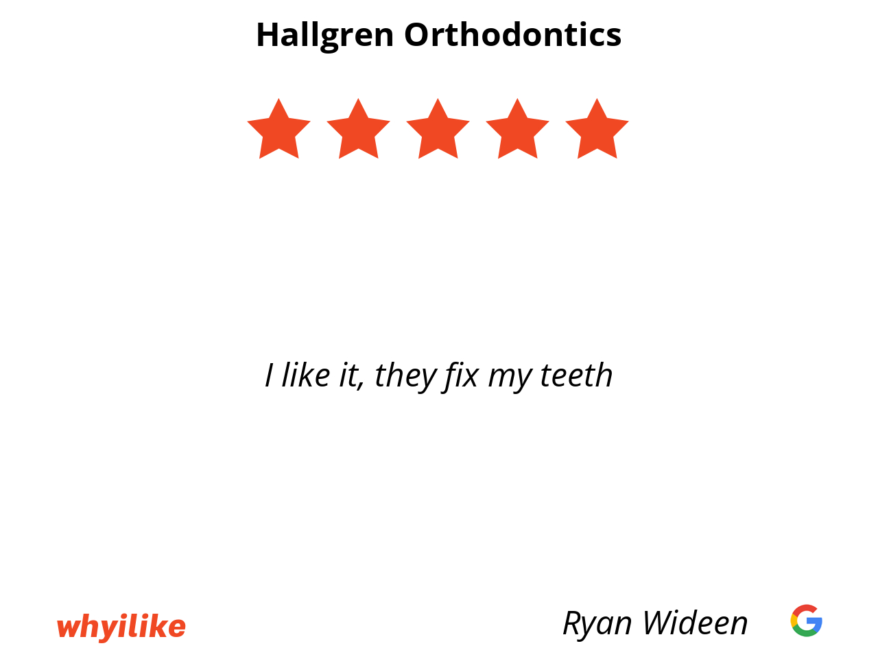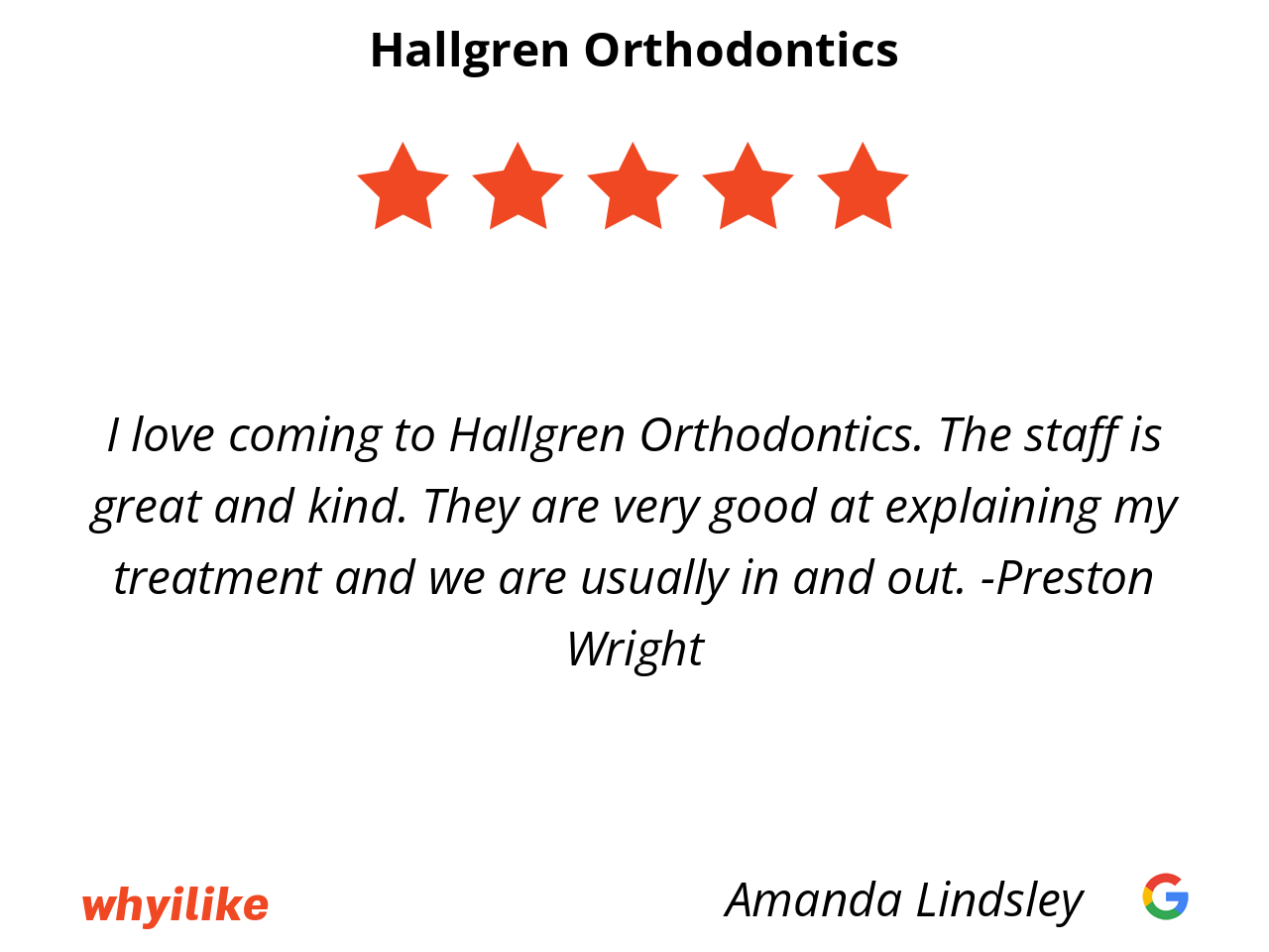 I love coming to Hallgren Orthodontics. The staff is great and kind. They are very good at explaining my treatment and we are usually in and out. -Preston Wright