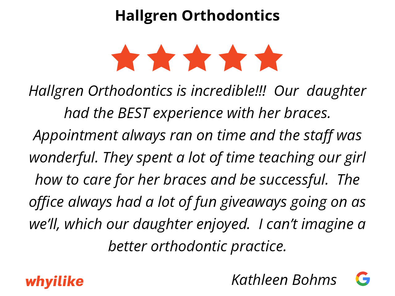 Hallgren Orthodontics is incredible!!! Our daughter had the BEST experience with her braces. Appointment always ran on time and the staff was wonderful. They spent a lot of time teaching our girl how to care for her braces and be successful. The office always had a lot of fun giveaways going on as we’ll, which our daughter enjoyed. I can’t imagine a better orthodontic practice.