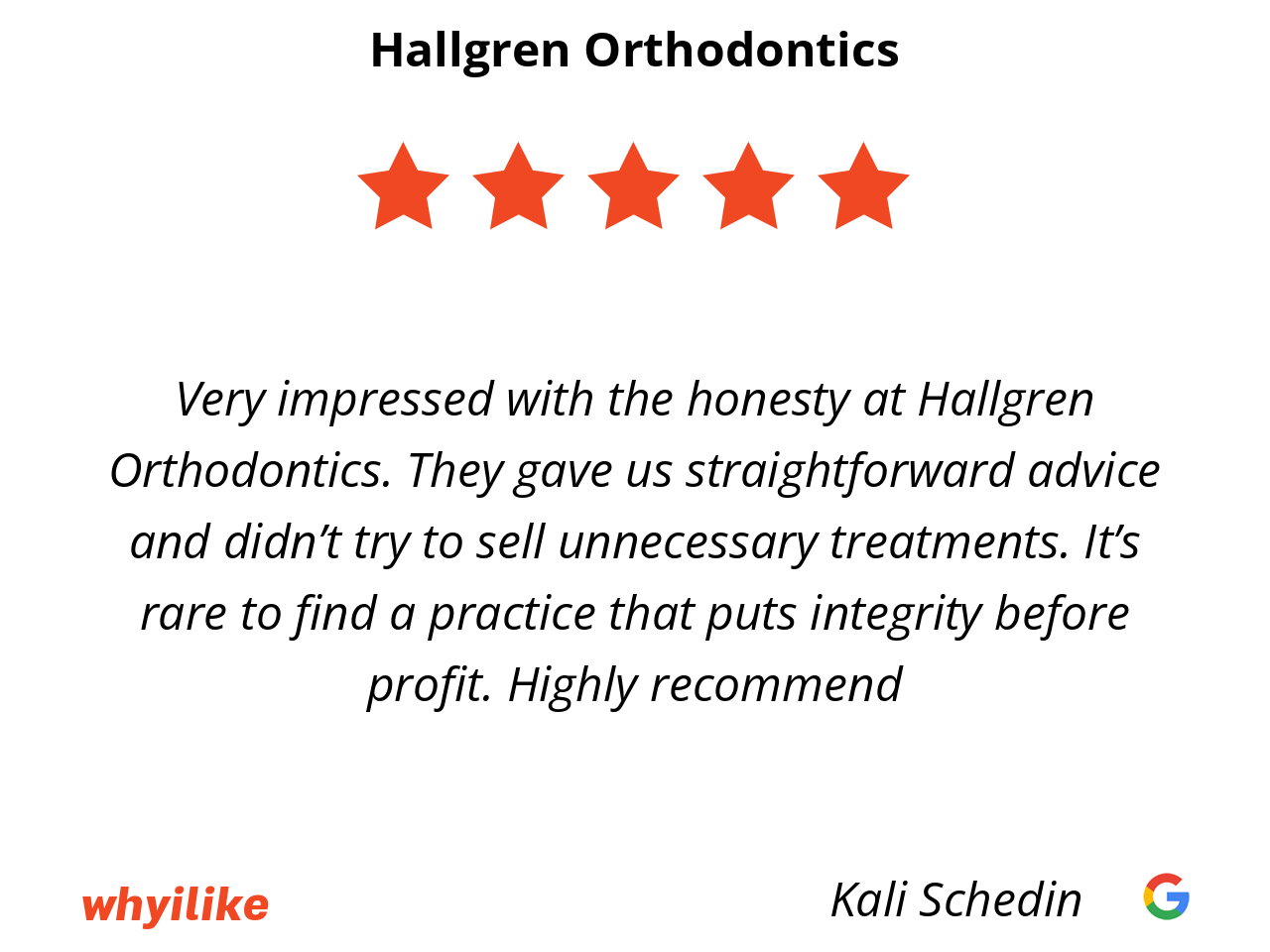 Very impressed with the honesty at Hallgren Orthodontics. They gave us straightforward advice and didn’t try to sell unnecessary treatments. It’s rare to find a practice that puts integrity before profit. Highly recommend