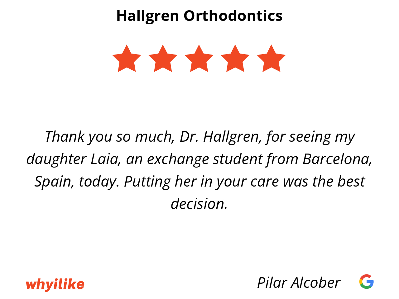 Thank you so much, Dr. Hallgren, for seeing my daughter Laia, an exchange student from Barcelona, Spain, today. Putting her in your care was the best decision.