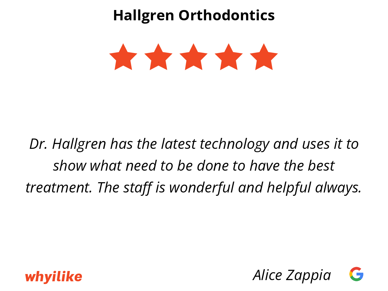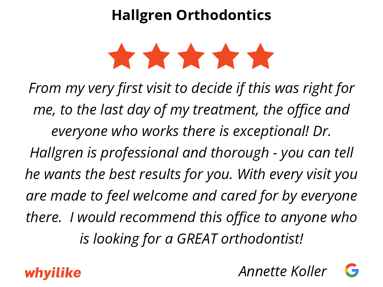 From my very first visit to decide if this was right for me, to the last day of my treatment, the office and everyone who works there is exceptional! Dr. Hallgren is professional and thorough - you can tell he wants the best results for you. With every visit you are made to feel welcome and cared for by everyone there. I would recommend this office to anyone who is looking for a GREAT orthodontist!
