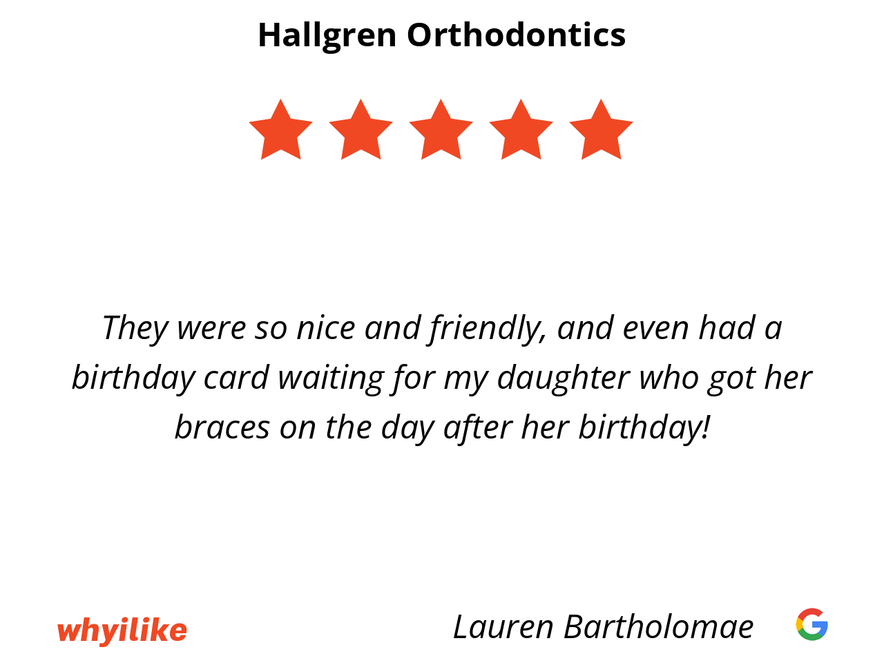 Hallgren Orthodontics has been a wonderful experience. Staff is accommodating, kind, and explains the whole process thoroughly, both to caregivers and kids!